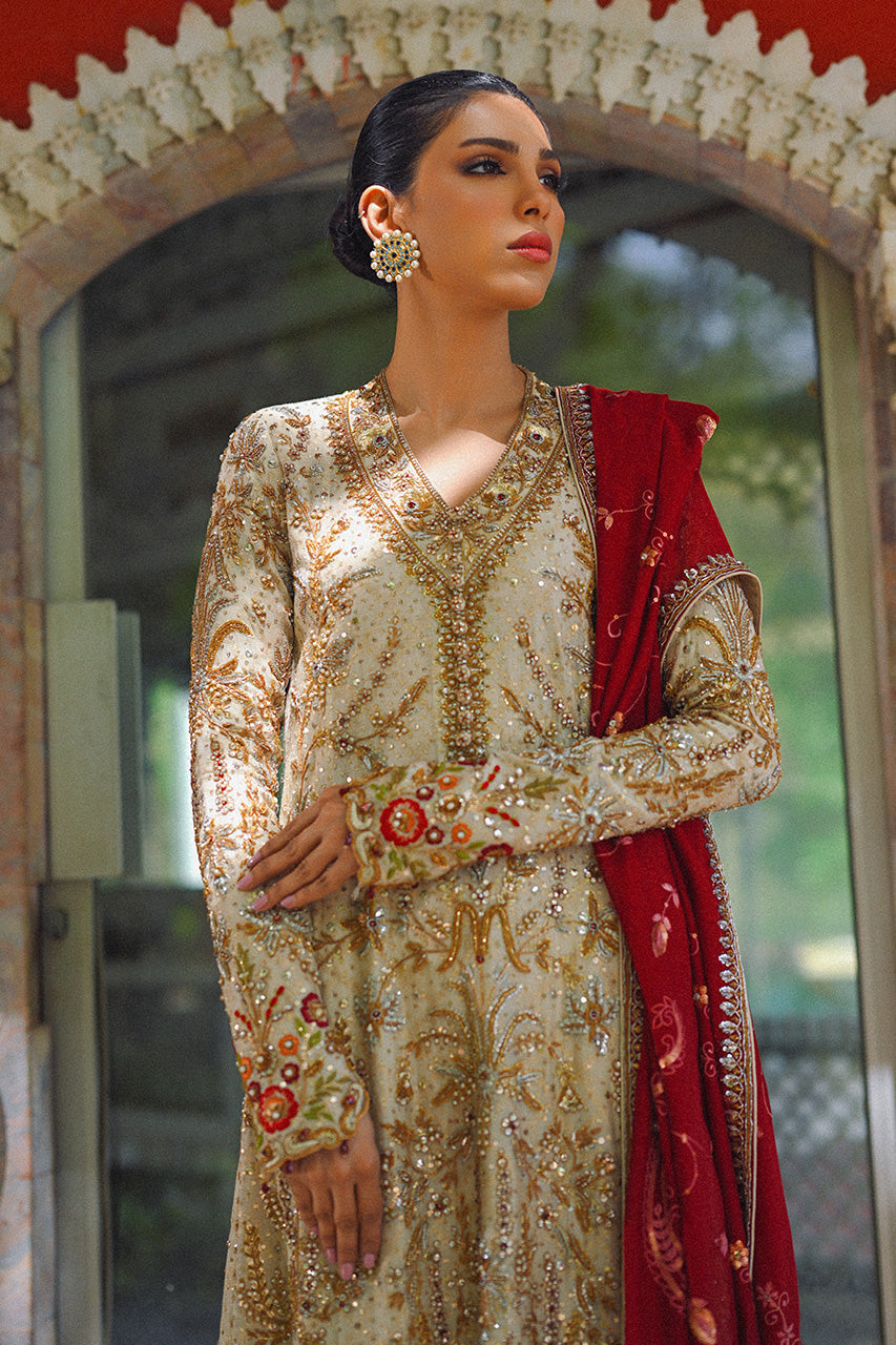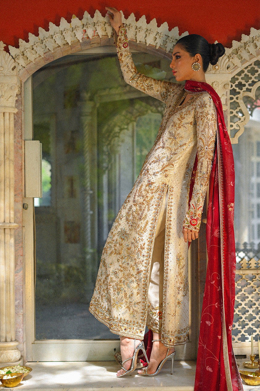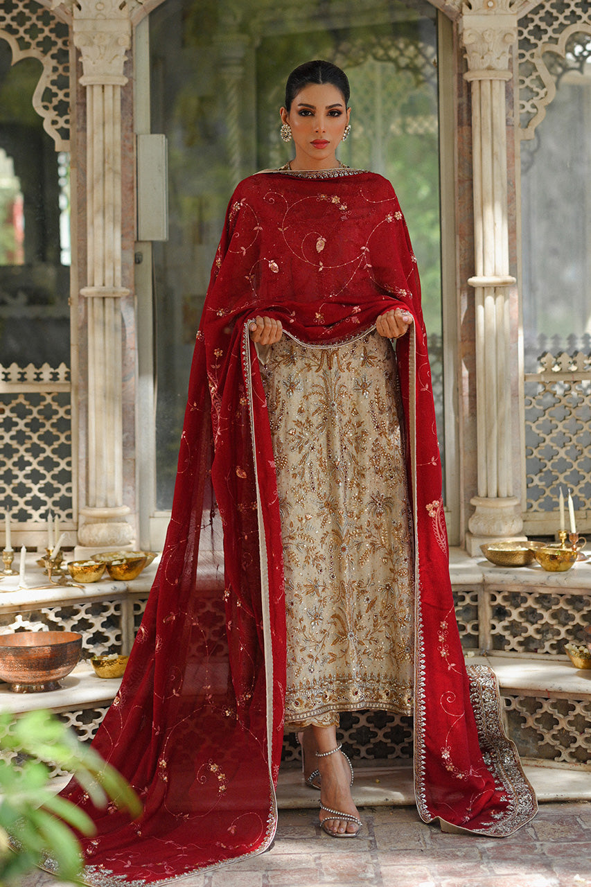 An ivory cotton net long shirt with raw silk izaar features zardoze and resham embroidery. It is paired with a complementing crimson embellished dupatta.Â