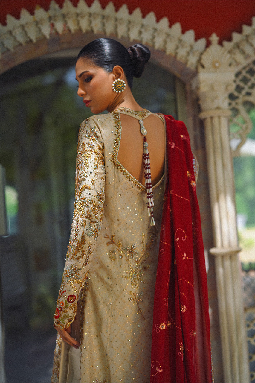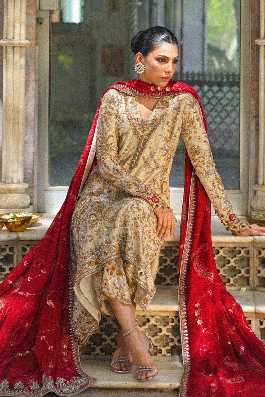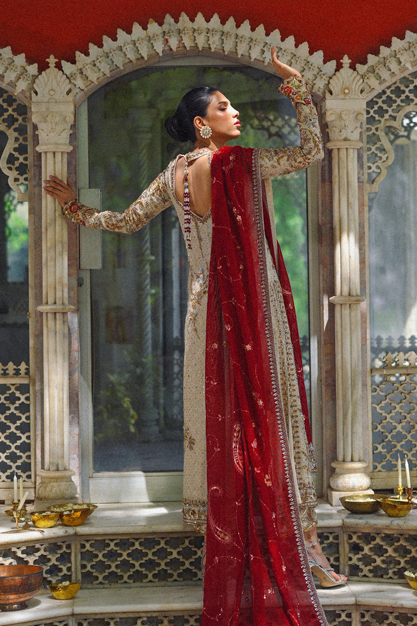 An ivory cotton net long shirt with raw silk izaar features zardoze and resham embroidery. It is paired with a complementing crimson embellished dupatta.Â