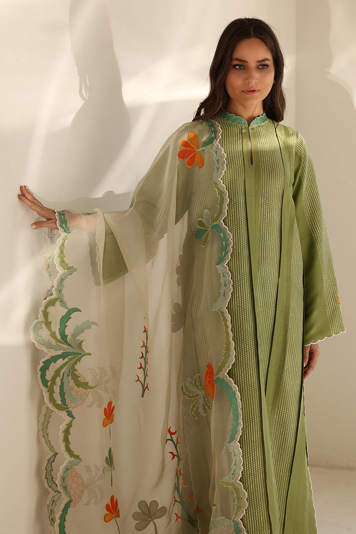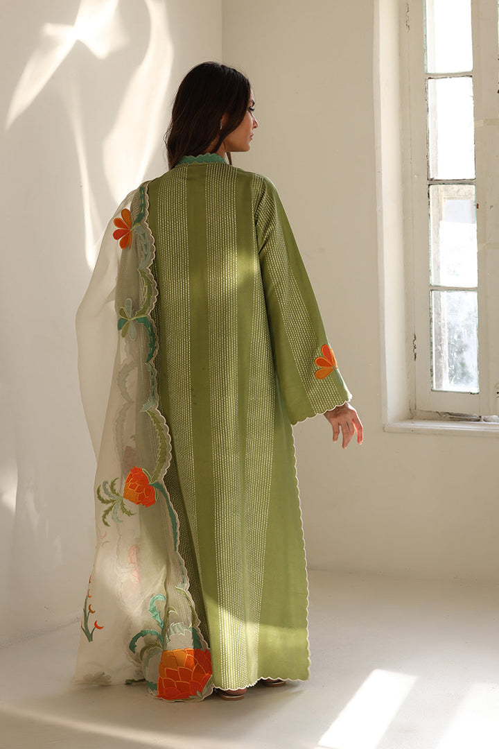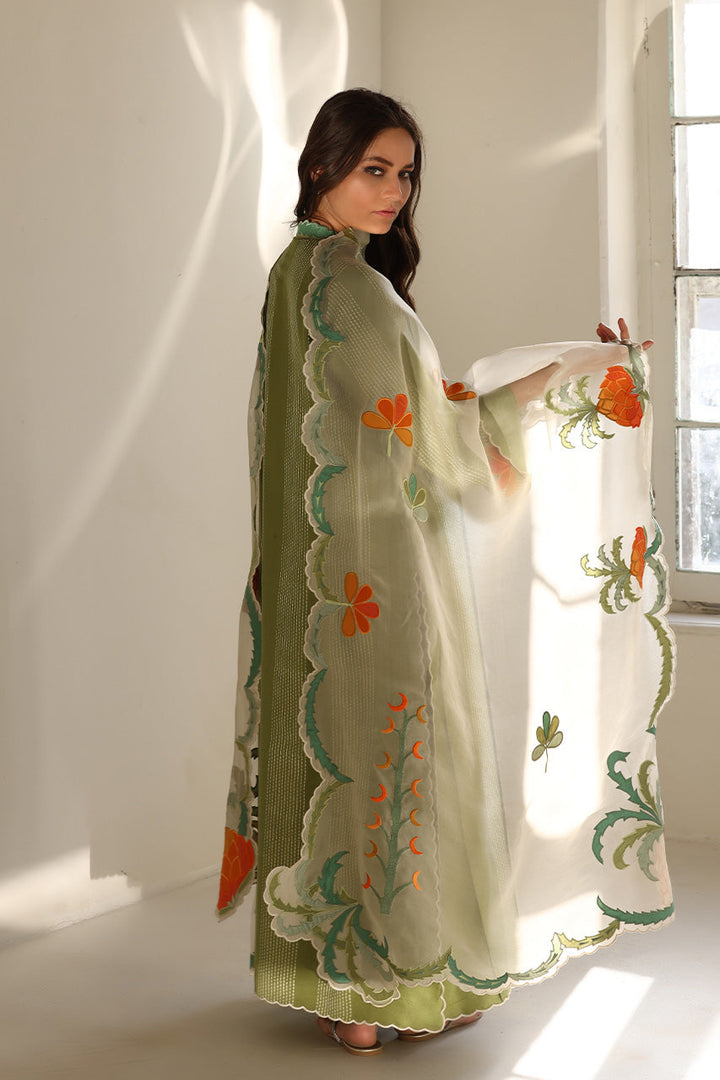 An earthy, pistachio hued relaxed silhouette is crafted from pure rawsilk with delicate kantha inspired block print elevating the length of the shirt featuring a scalloped applique band collar. Intricate floral applique embroidery blooms along the organza dupatta’s scalloped edges and sleeves of the shirt. The artisanal ensemble is paired with matching pure rawsilk trousers.