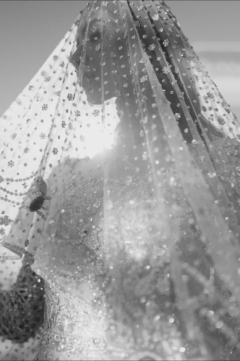 A vision in a frosted mint hue, this sweeping peshwas is sculpted from cotton net and embroidered with luminous silver zardozi, glistening crystal work, and delicate resham florals in the softest whispers of blush and mint. The fitted bodice, punctuated with intricate cutwork sleeves, reveals artisanal mastery that weaves heritage and modernity into a seamless narrative. Cascading kalidaar drapery is framed by an elaborate cutwork border that grazes the floor with ethereal grandeur. A gossamer tulle dupatta, dusted with shimmering sequins and framed with handworked scalloped edging, floats effortlessly around the silhouette. The look is completed with a dramatic cut-out back, delicately tied with a minimalist pearl tassel dori, lending a final flourish of couture craftsmanship.