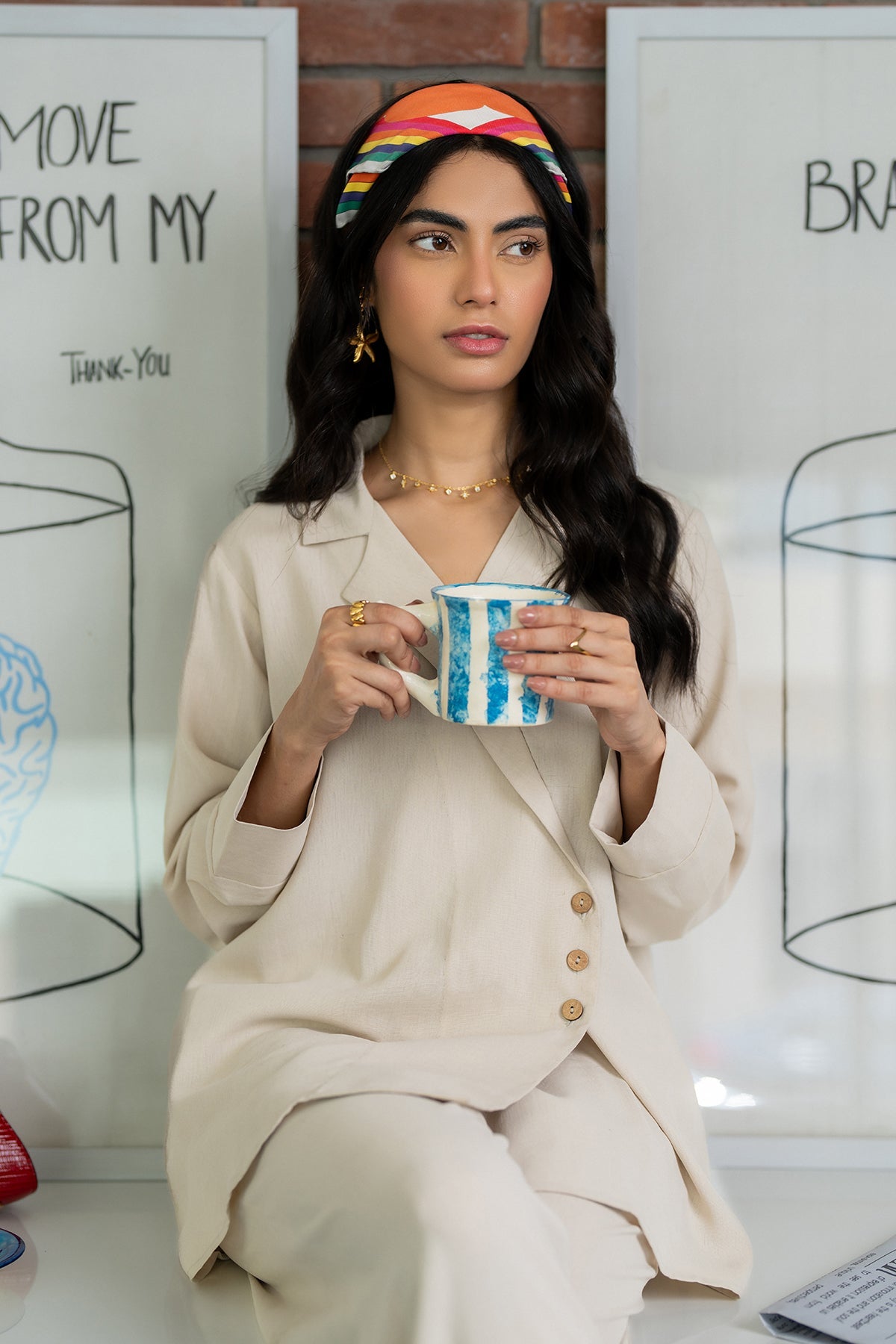 This Neutral Beige Co-Ord Set Features A Chic Overlapped Top With Wooden Button Details, Paired With Matching Bell Bottoms.