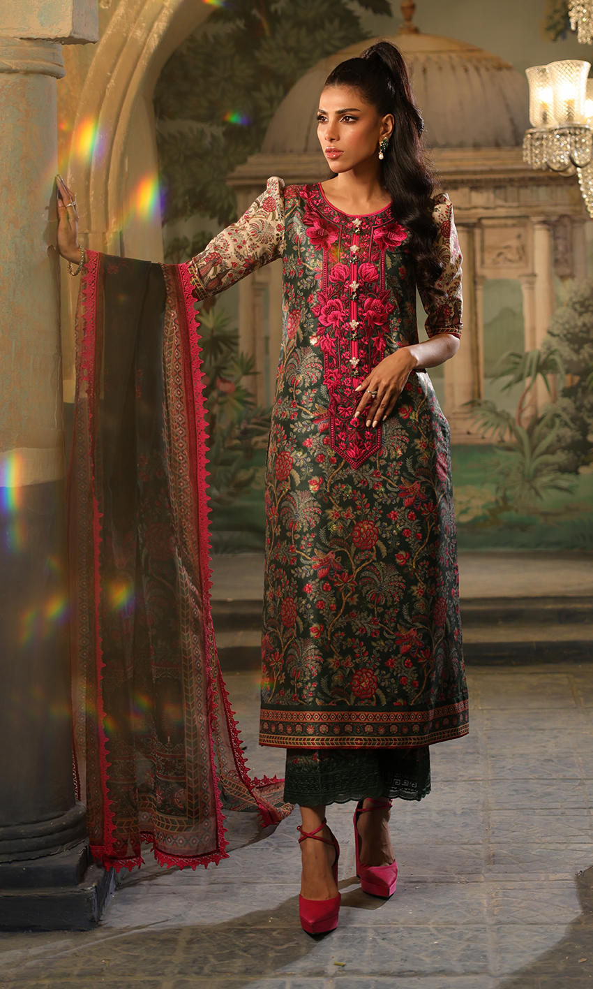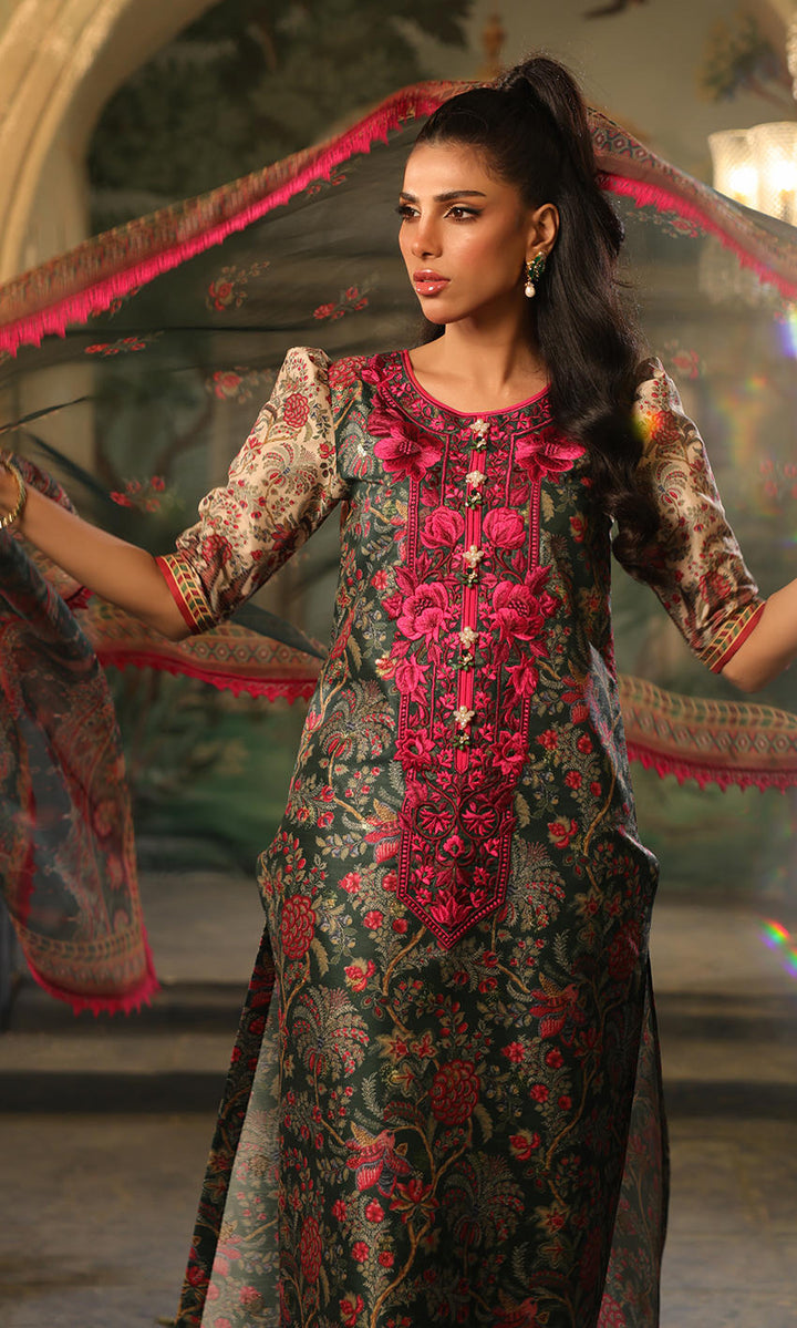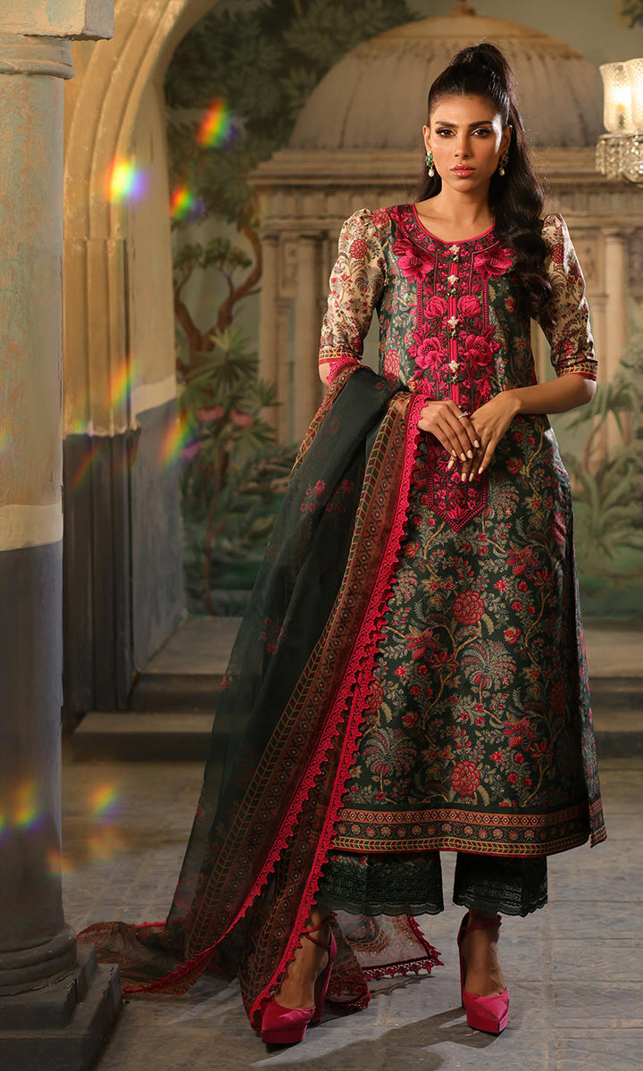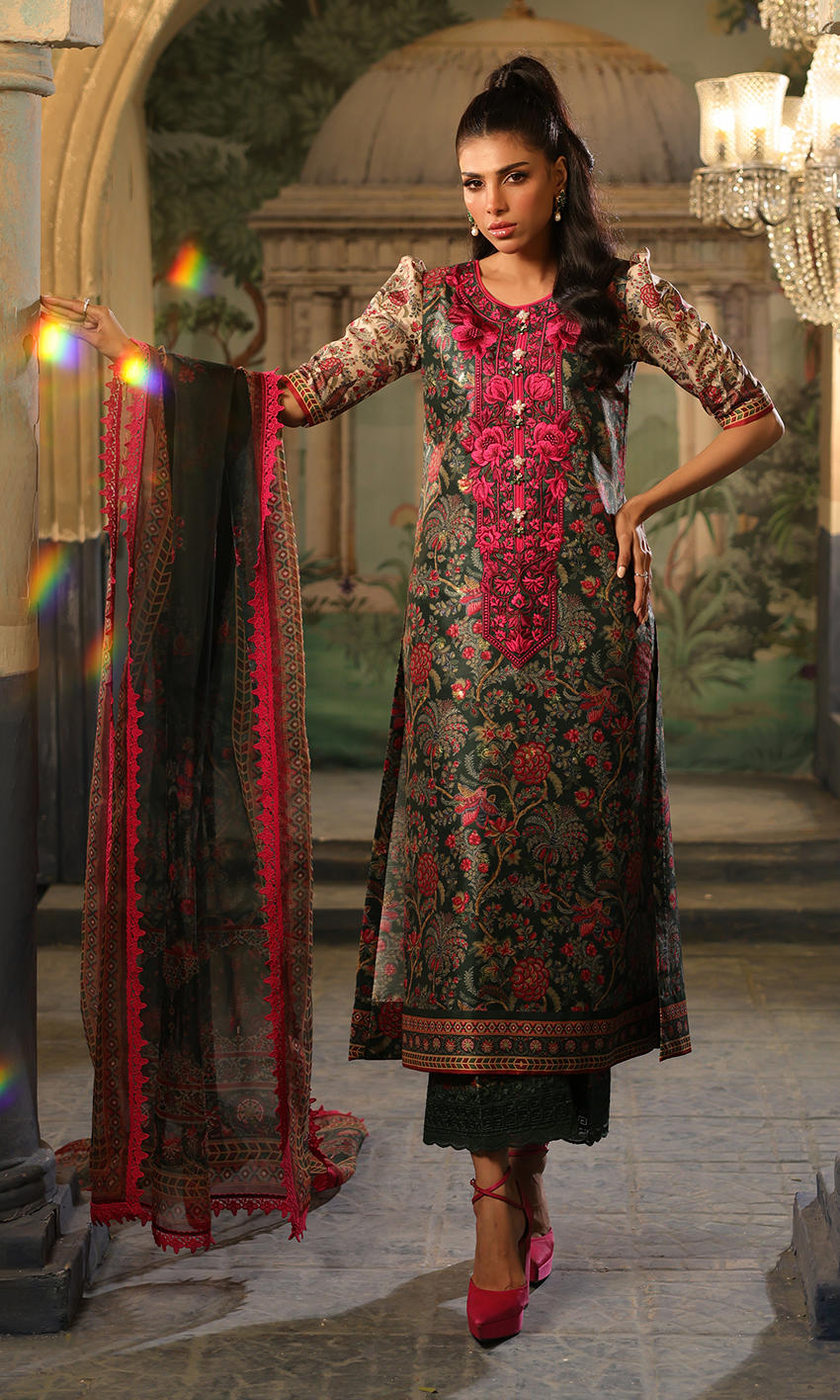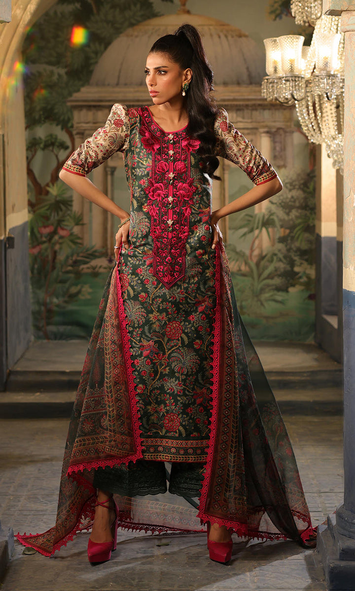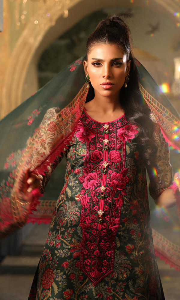 A fuchsia pink embroidered neckline with button details on a dark green base, with contrast sleeves.