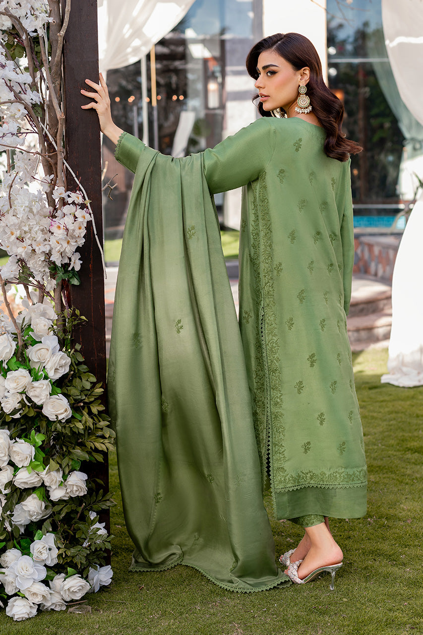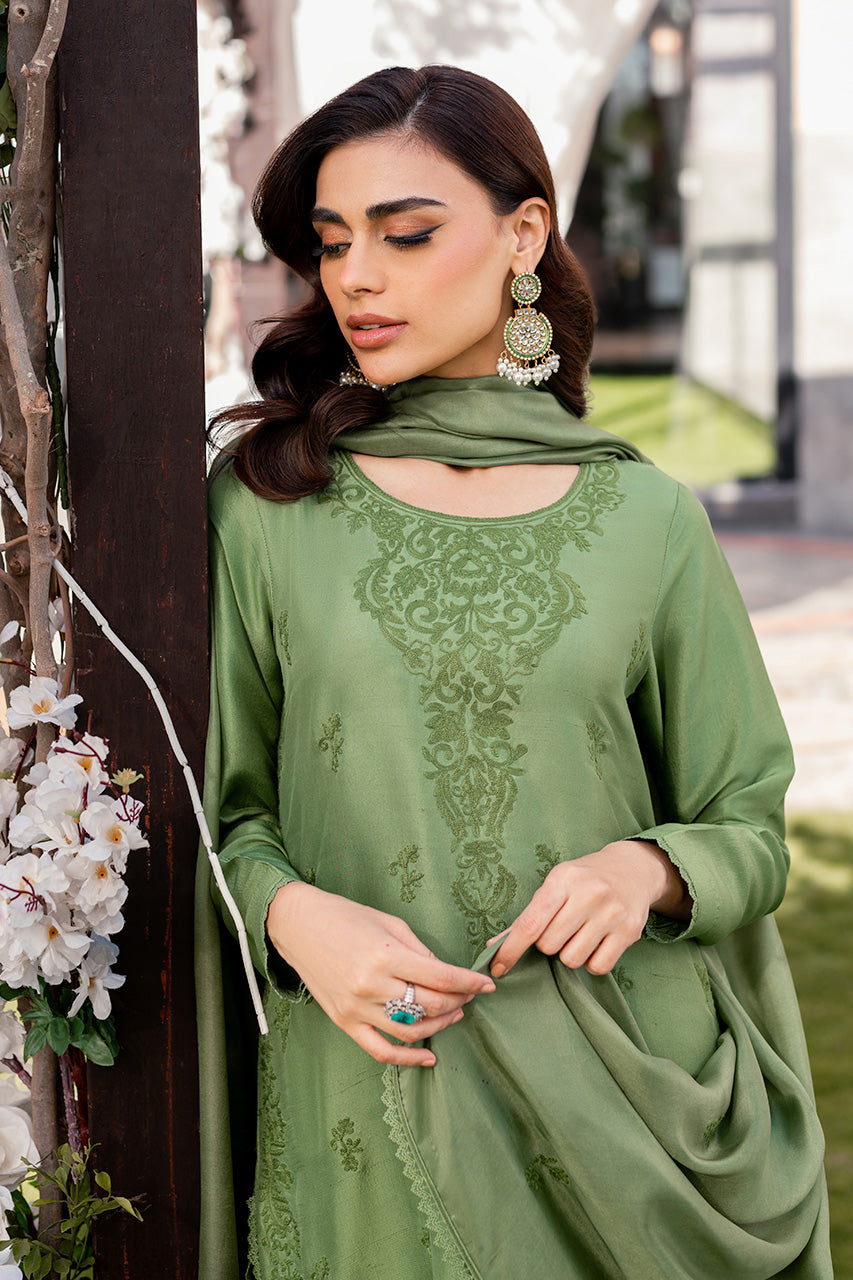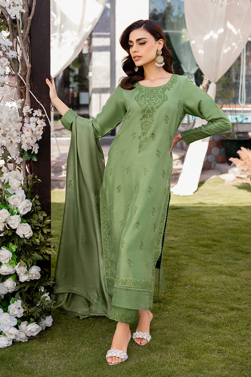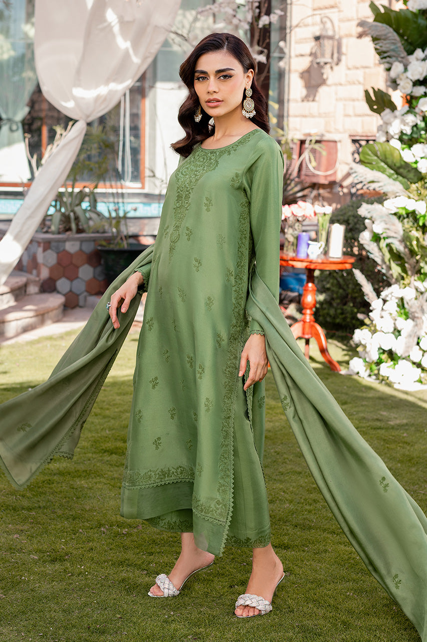 The sheer elegance of luxurious raw silk shirt, delicately adorned with intricate Ari embroidery. The captivating front neckline, embellished with enchanting booties, exudes timeless charm. Both front and back are adorned with a graceful organza border, meticulously detailed with exquisite namak para lace, elevating every movement with grace and allure. Paired effortlessly with embroidered raw silk ezar and a medium silk embroidered dupatta, this ensemble epitomizes sophistication.ÂÂ