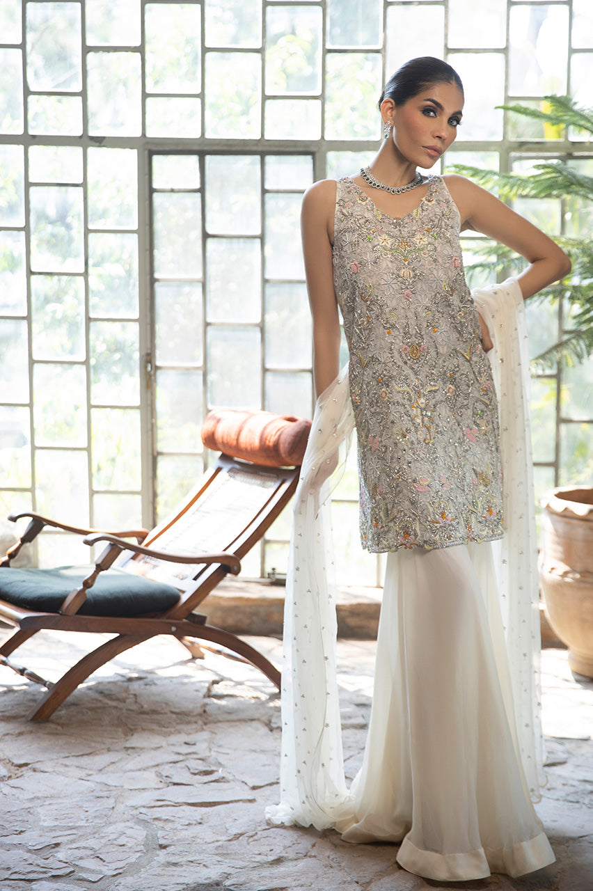 An ivory, net shirt designed with hand embroidery on the front and back; paired with a matching, chiffon plain gharara and a chiffon dupatta crafted with hand embroidery.