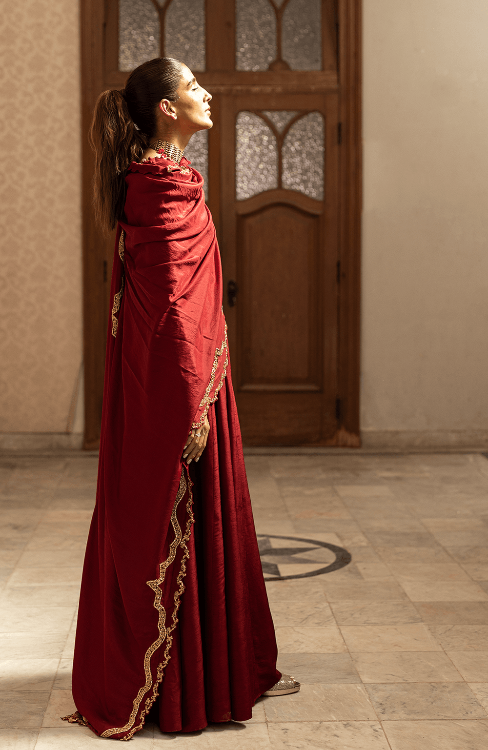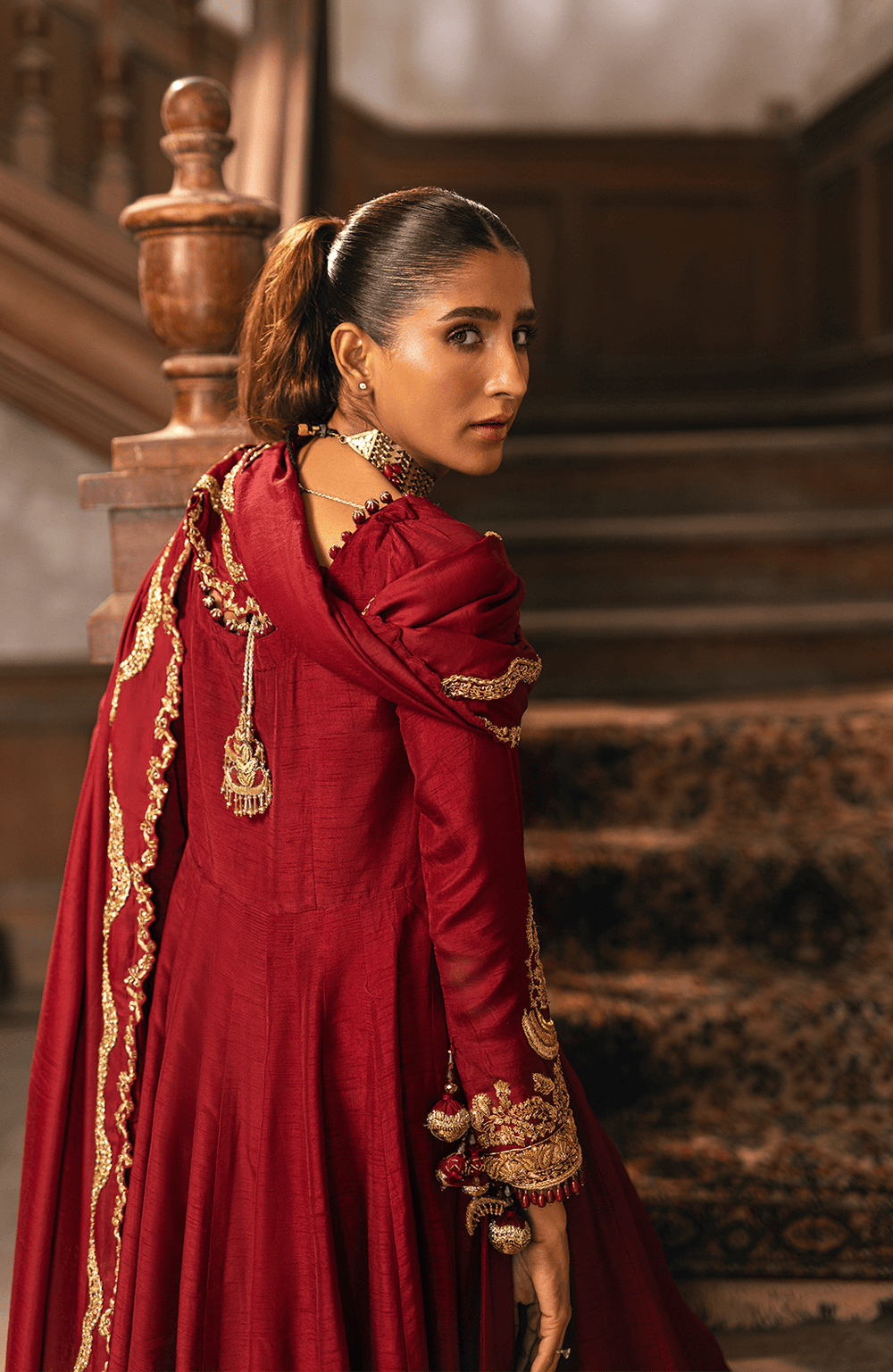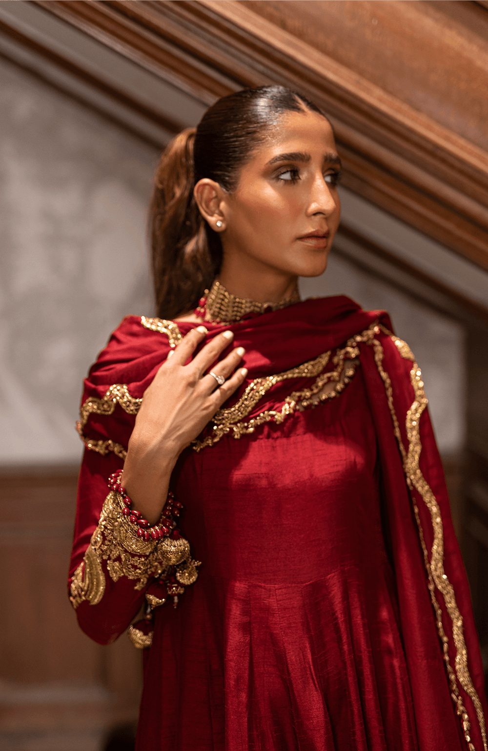 Elegance is personified in every stitch, Ghazal ensemble features naqshi, dabka and kamdaani work mixed with more artisan charm. The frock made in Korean raw silk exudes sophistication and royalty, while the katan silk dupatta adds grace to the ensemble. Ghazal is a perfect amalgamation of craftsmanship and modern allure.