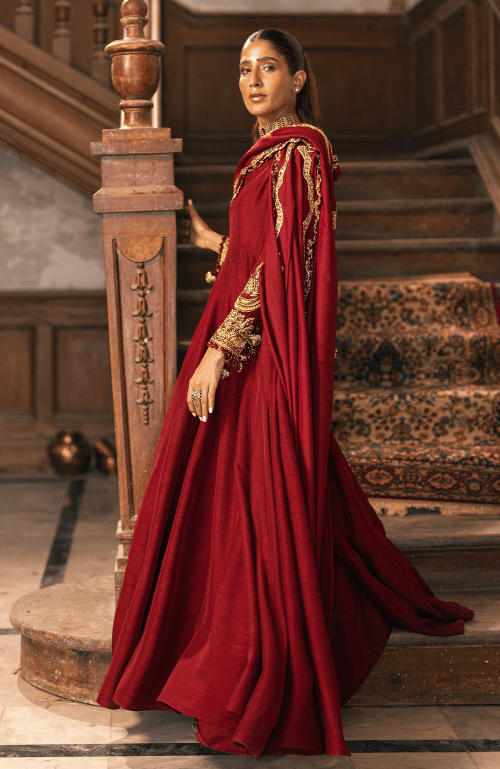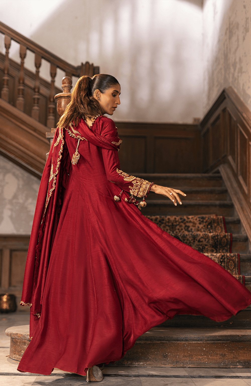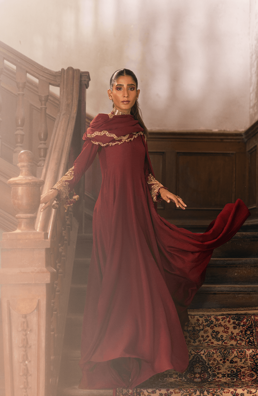 Elegance is personified in every stitch, Ghazal ensemble features naqshi, dabka and kamdaani work mixed with more artisan charm. The frock made in Korean raw silk exudes sophistication and royalty, while the katan silk dupatta adds grace to the ensemble. Ghazal is a perfect amalgamation of craftsmanship and modern allure.