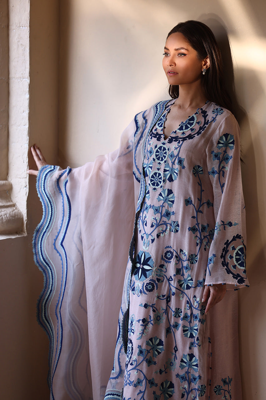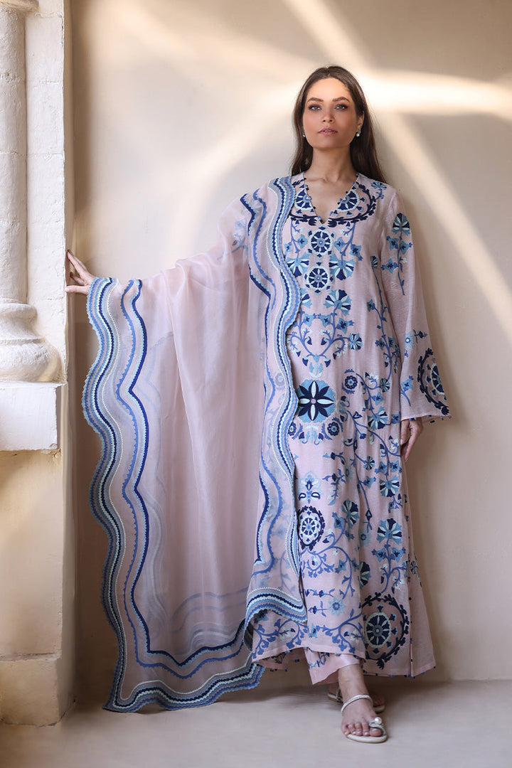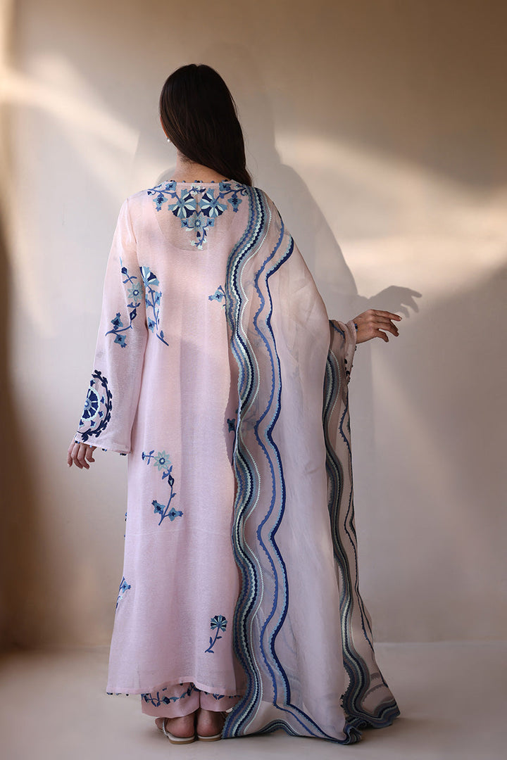 A statement salmon hued shirt is adorned with intricate cerulean aari embroidery, inspired by botanical motifs, cascading effortlessly down the khaddi corduroy canvas. Accented with applique details, the shirt is paired with an organza dupatta featuring aari embroidery and scalloped borders. Salmon toned matching pure rawsilk trousers complete the look.