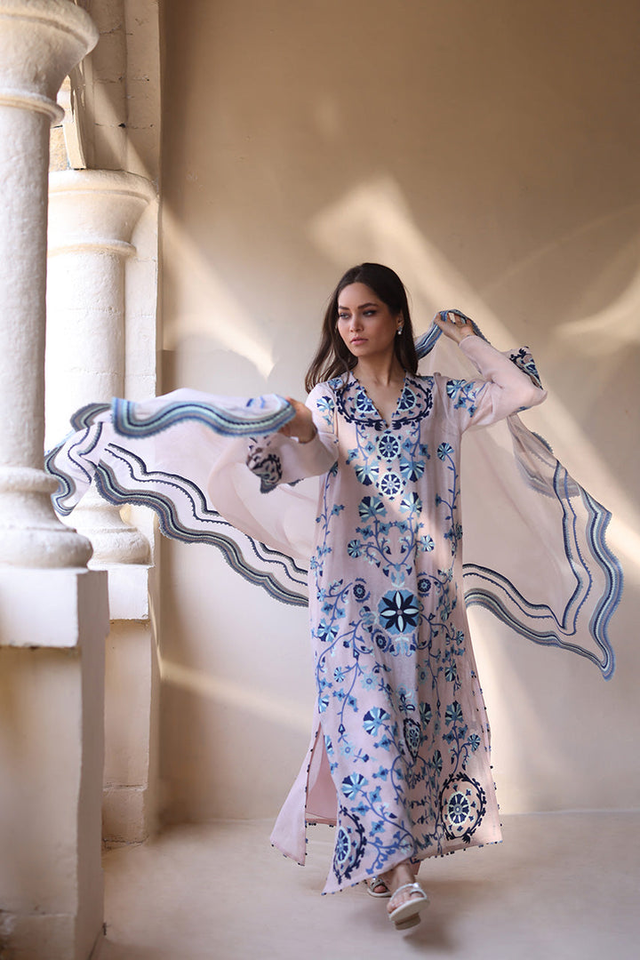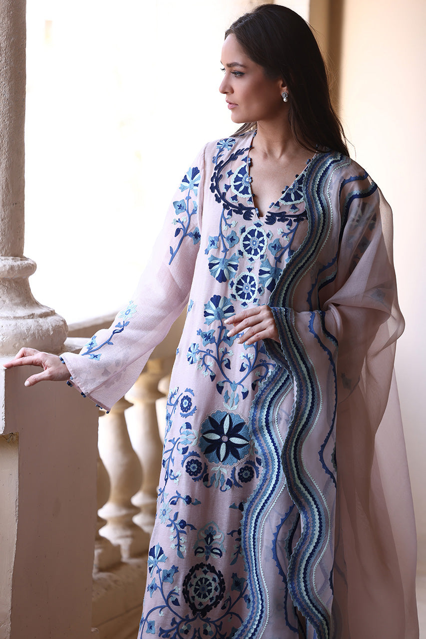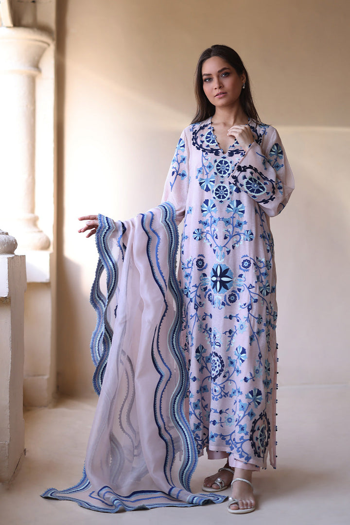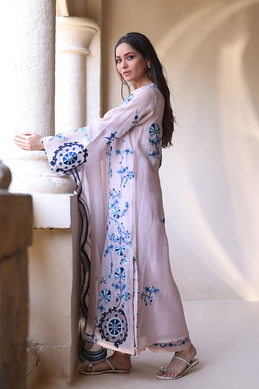 A statement salmon hued shirt is adorned with intricate cerulean aari embroidery, inspired by botanical motifs, cascading effortlessly down the khaddi corduroy canvas. Accented with applique details, the shirt is paired with an organza dupatta featuring aari embroidery and scalloped borders. Salmon toned matching pure rawsilk trousers complete the look.