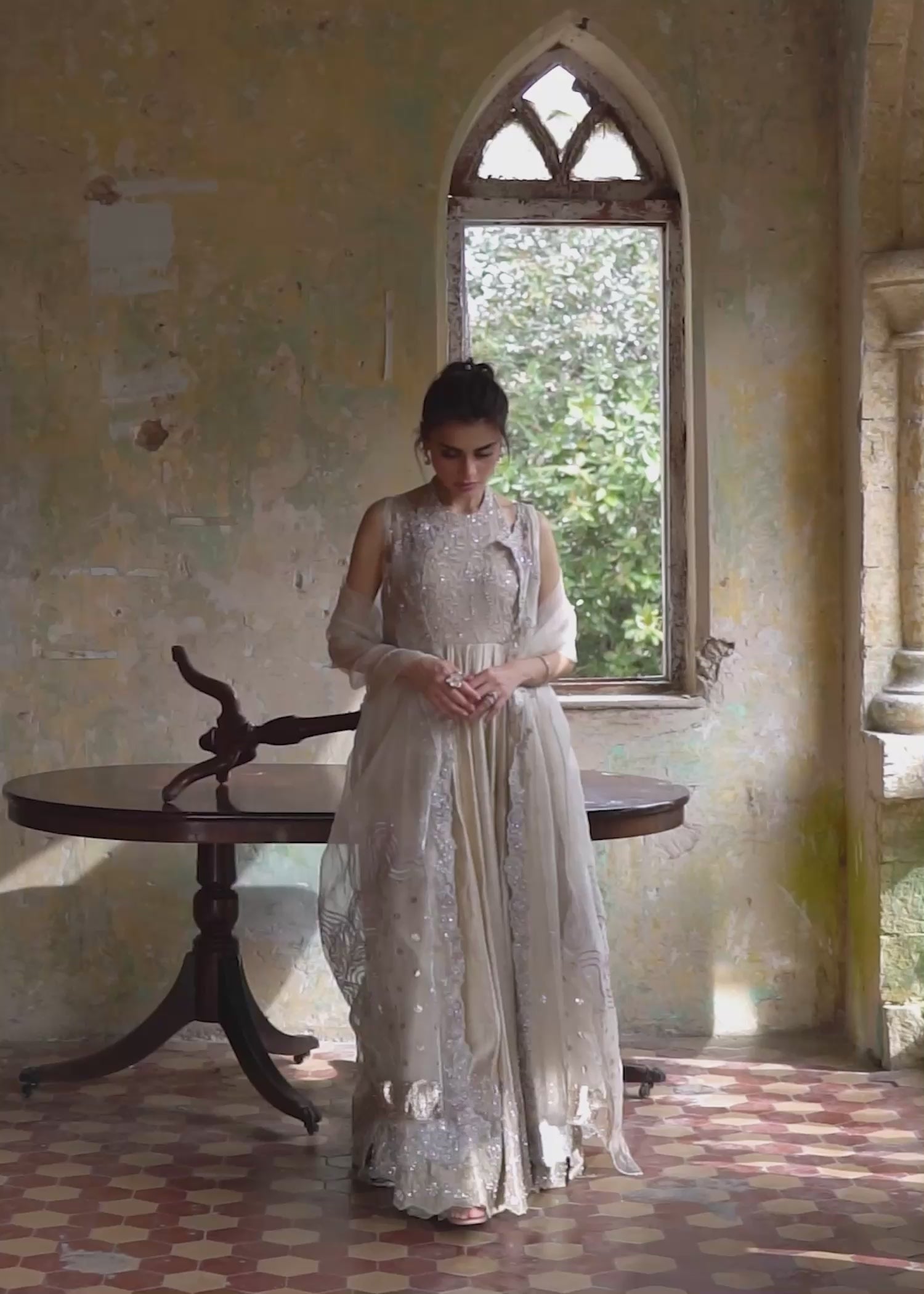 Modern pearl white chic jacket, crafted from pure organza, features intricate hand embroidery in pastel threads and colorful sequins. It is paired with a halter-neck bodice gown, which also boasts hand embellishments. Completing the ensemble is a dupatta adorned with a psychedelic pattern on its sides, adding a subtle touch to the sophisticated look.