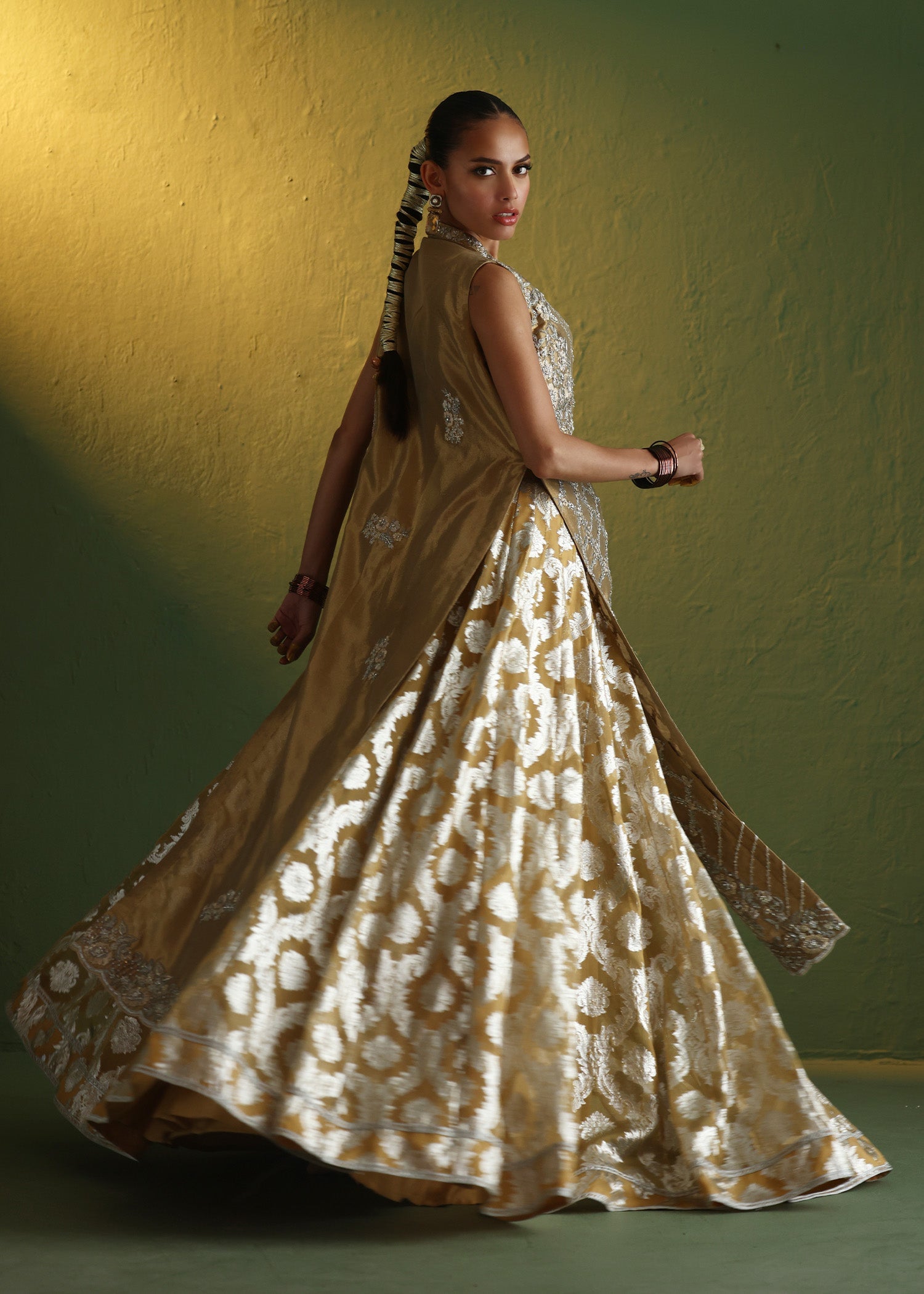 The jacket is crafted from golden Pure french Lama with a front-open style, adorned with floral designs and delicate hand embroidery. Paired with a lehenga made from elegant Pure self Mysore organza.