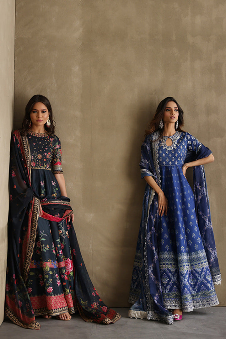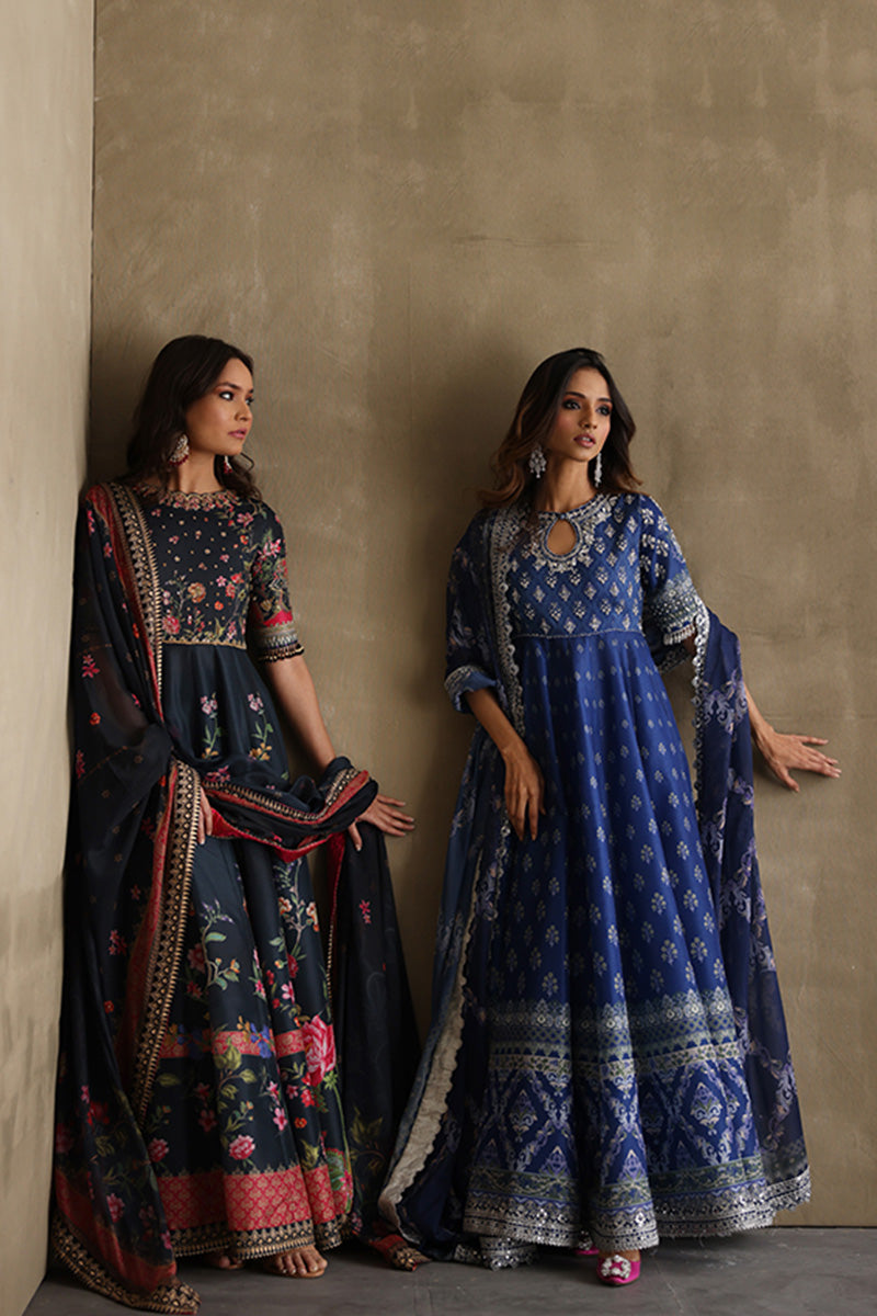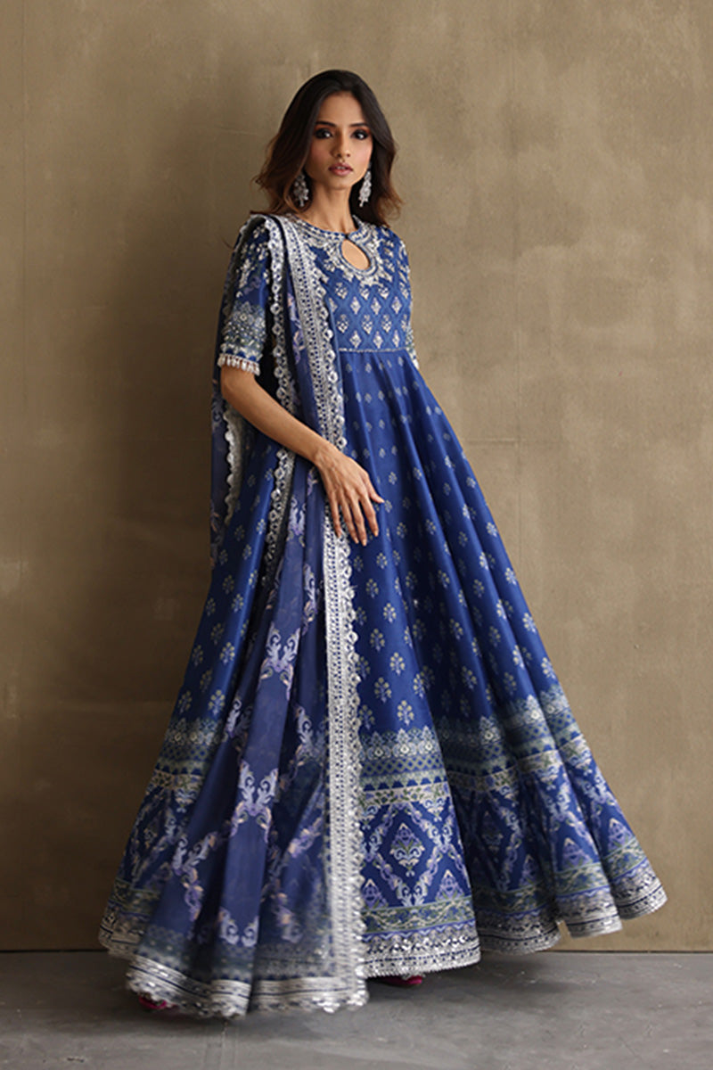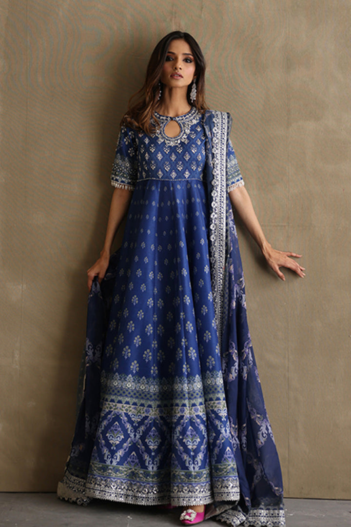 Classic and elegant, this MH printed pishwas is striking and beautiful with a zardozi hand embellished neckline and sleeves and embroidered border on the flare and dupatta.