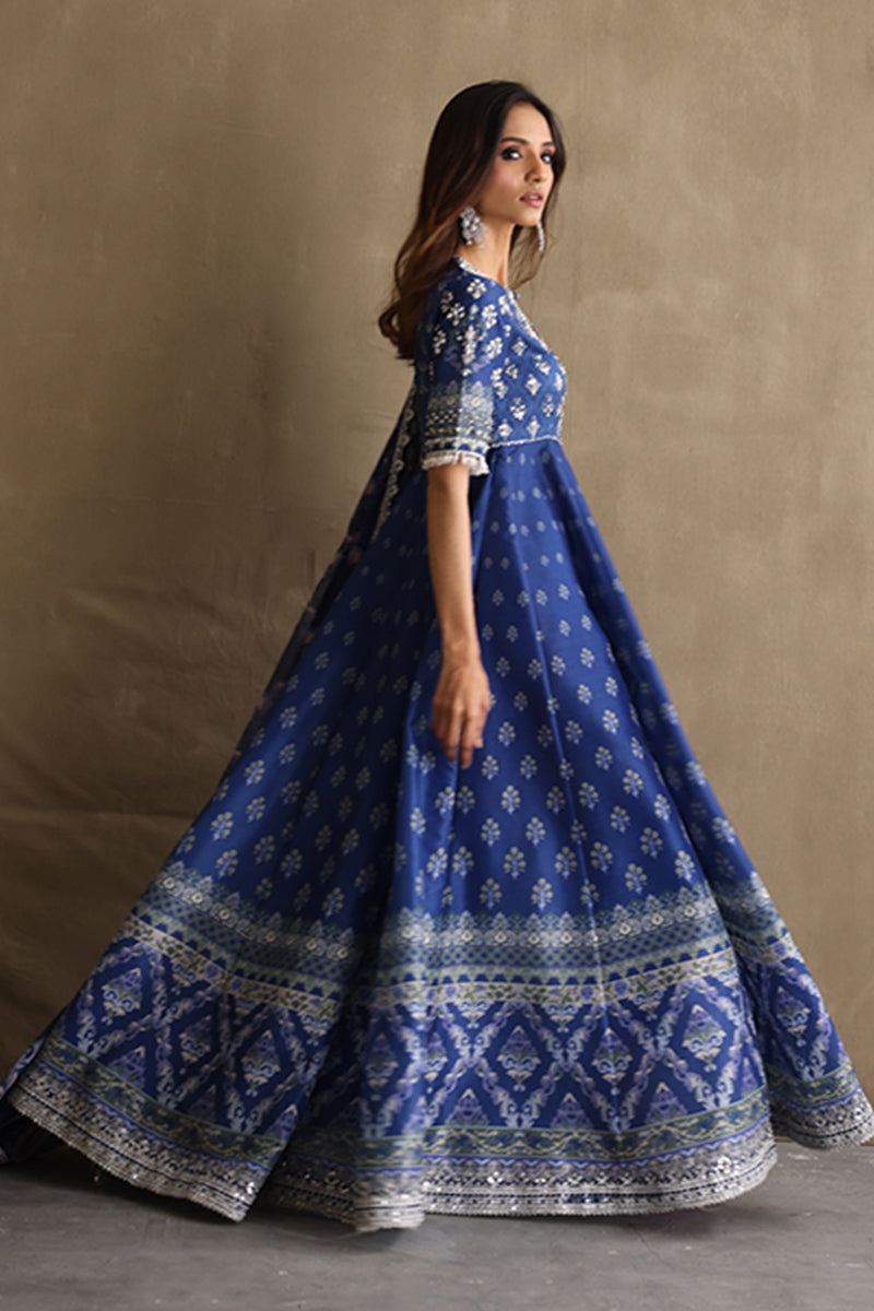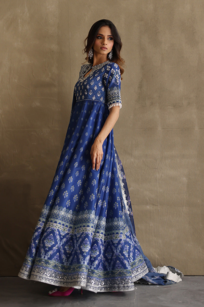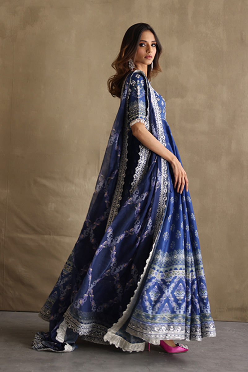 Classic and elegant, this MH printed pishwas is striking and beautiful with a zardozi hand embellished neckline and sleeves and embroidered border on the flare and dupatta.