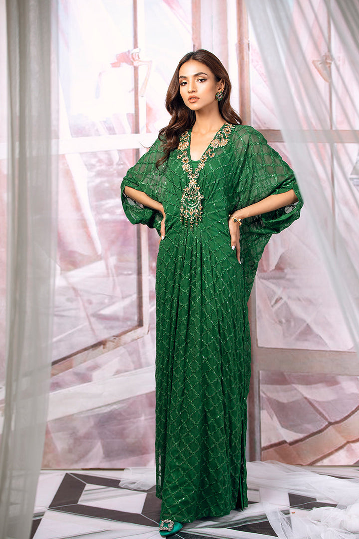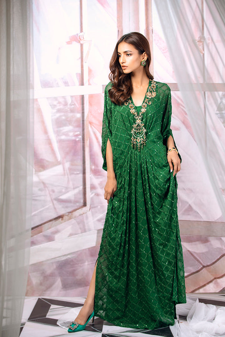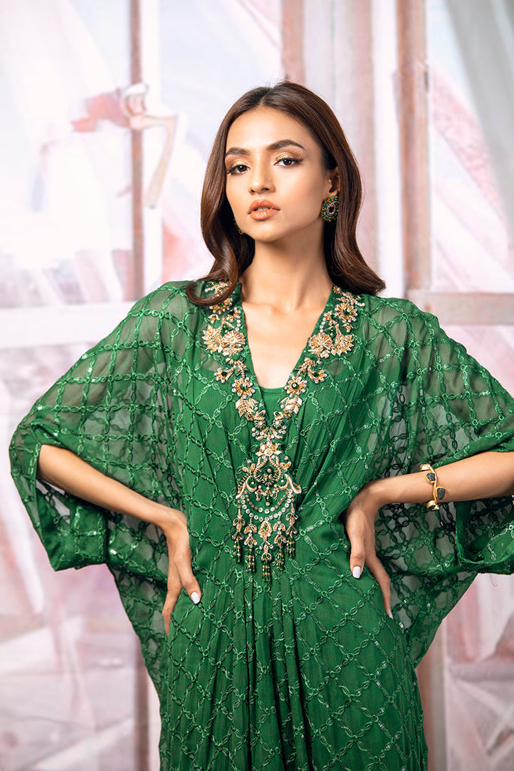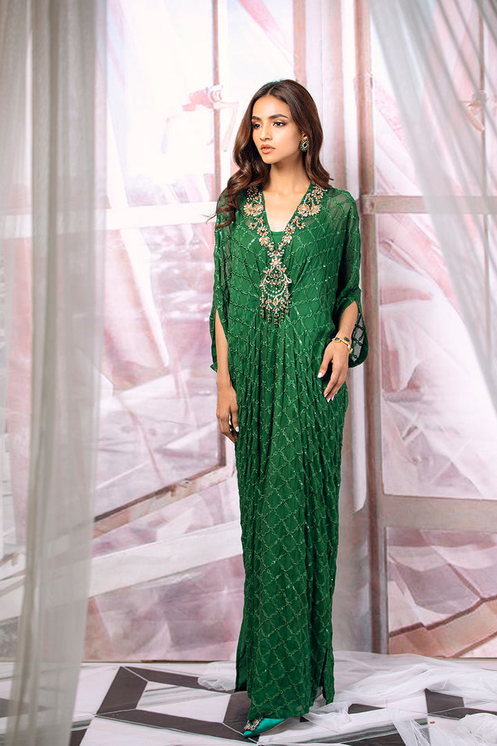 A striking emerald green to make you stand out in the crowd! Embroidered chiffon with a hand worked crystal and gold pendant neckline! Comes with a slip.