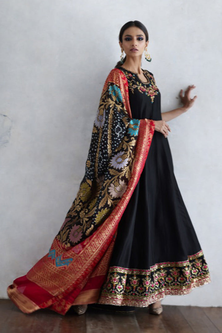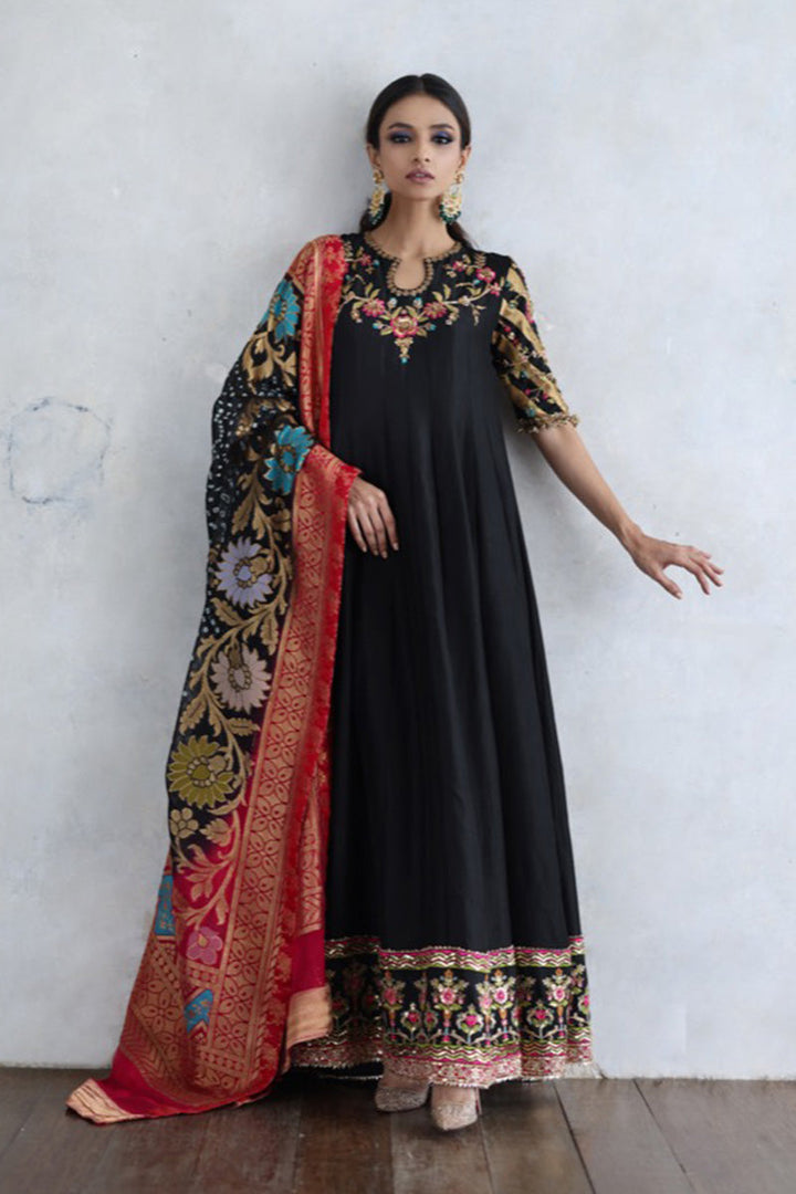 Cut to flatter any silhouette, the our sinature pishwaas in black will make you look super elegant. Delicate zardozi, dabki and nakshi kaam on the neck and sleeves add in glamour to the outfit. The floral dupatta is absolutely exquisite and the colour matching sleeves make this outfit truly unique.