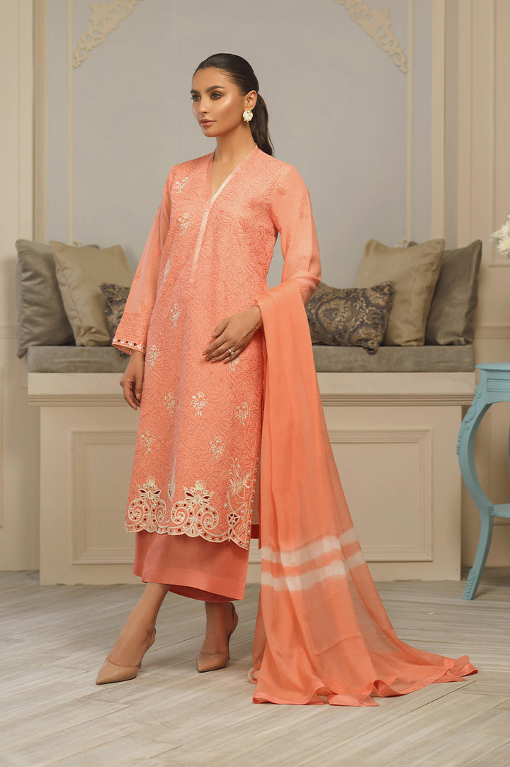 SHIRT: A peach, chikankari shirt designed with embroidery on the front and sleeve cuffs; made complete with cutwork detailing. DUPATTA: Chiffon shaded dupatta. CULOTTES: Raw silk plain culottes.
