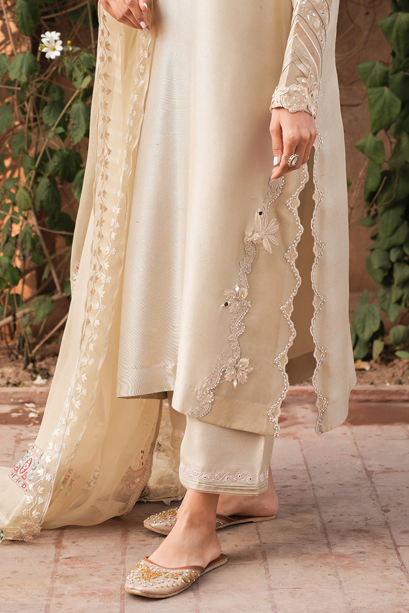 This elegant Heer outfit features a raw silk shirt with intricate machine embroidery, applique work, and shimmering shisha details. It is adorned with scallops on the choks and delicate handwork on the neck, sleeves, and choks. The shirt is paired with a raw silk izaar, embellished with resham machine embroidery and mirror work for a sparkling finish. Complementing the look is a pure organza dupatta, featuring machine embroidery and mirror hanging details. This ensemble beautifully blends traditional craftsmanship with modern style.