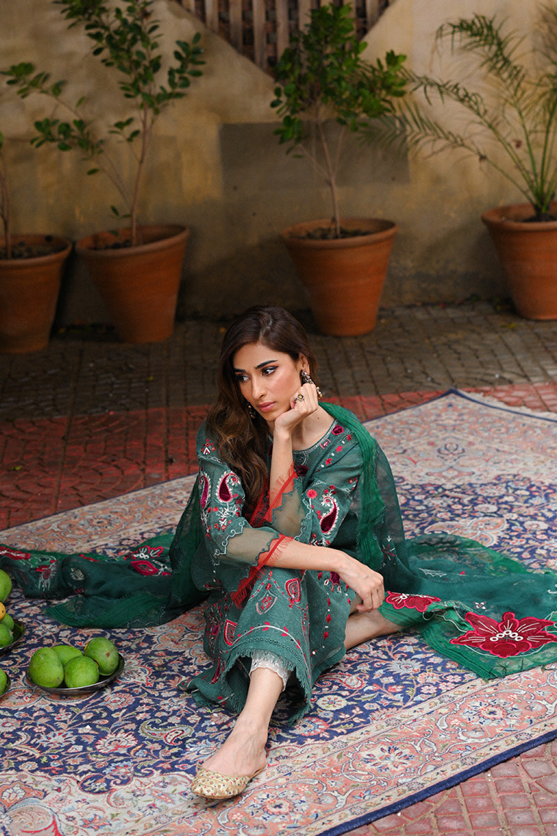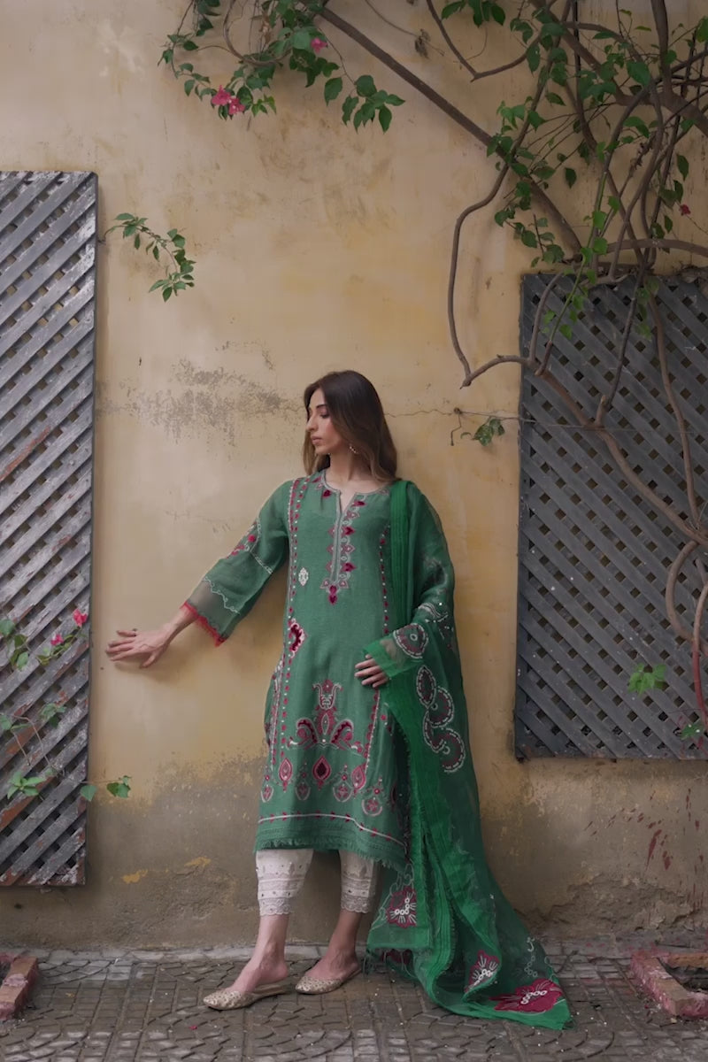 A verdant green embroidered canvas, featuring applique and mirror work with lace and shredding details on hem. Heer kurta is paired with a color-blocked organza dupatta, intricately designed with attention to detail making it the finest ensemble for you. Our Heer set is a perfect choice for your Eid celebrations. ÂÂ