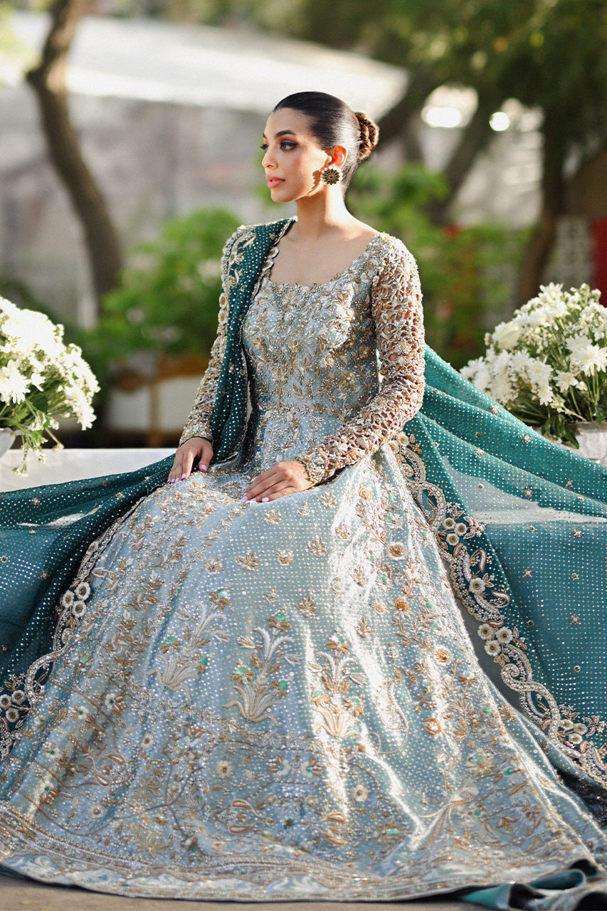 "Embodying timeless charm, a mint green hued tissue peshwas is adorned with a detailed composition of gold and silver zardoze and resham work. Featuring cutworked sleeves, the peshwas is paired with an elegant emerald green organza dupatta with sprinkled sequin work and floral zardoze borders."