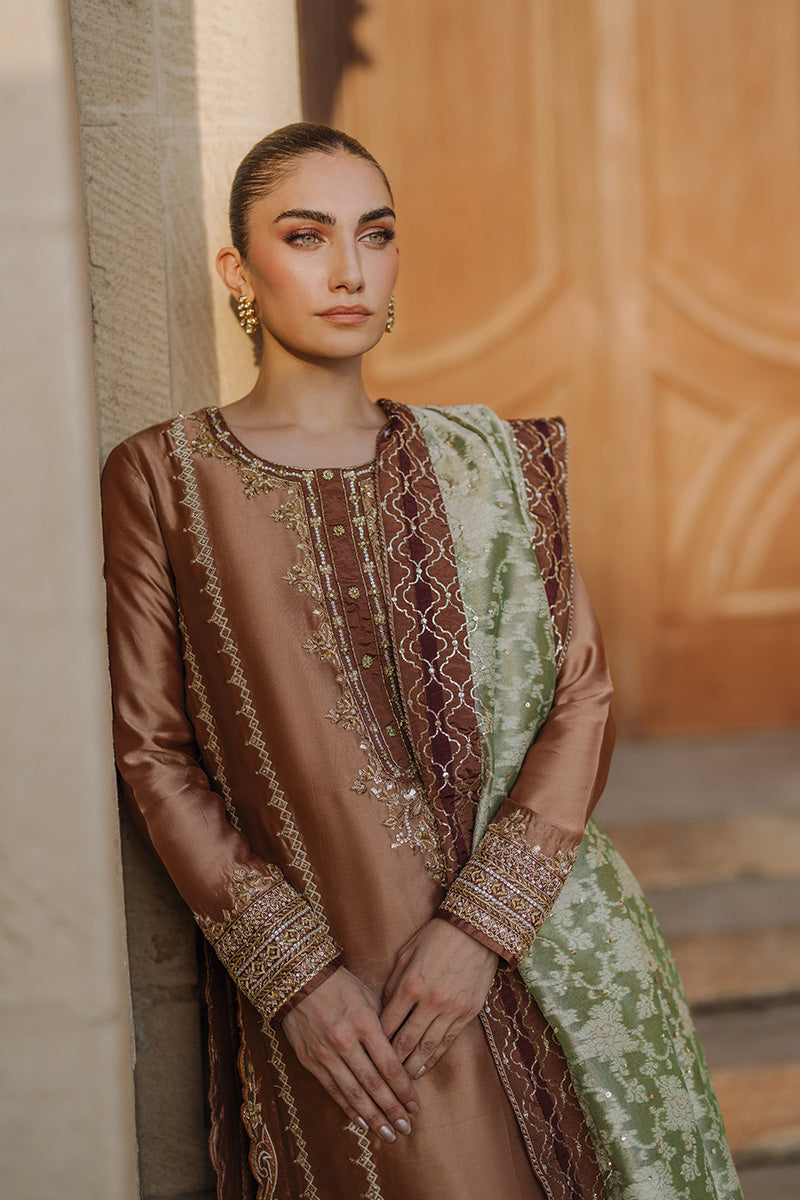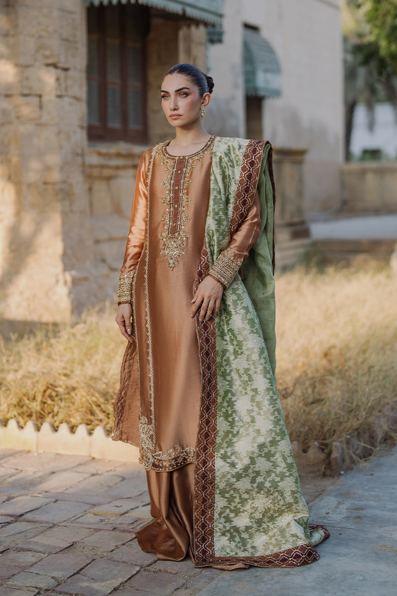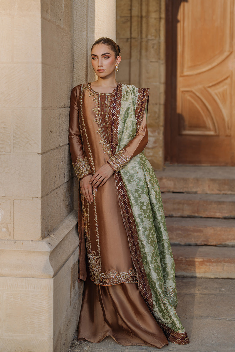 This exquisite green jacquard zari net shawl from our Festive Formal Collection is a masterpiece of elegance and intricate craftsmanship. The luxurious fabric is adorned with delicate hammer work and a soft sequence spray that adds a hint of sparkle. Beautiful appliqué kamdani detailing and tiki stone accents bring a refined texture, creating a perfect blend of traditional artistry and modern sophistication. This shawl is a stunning statement piece, ideal for elevating any outfit with its rich detailing and timeless appeal