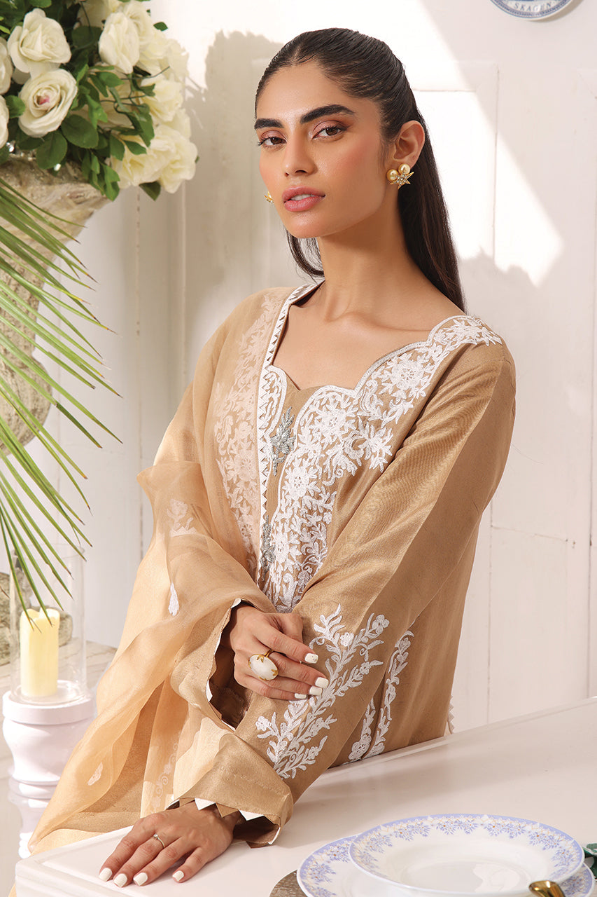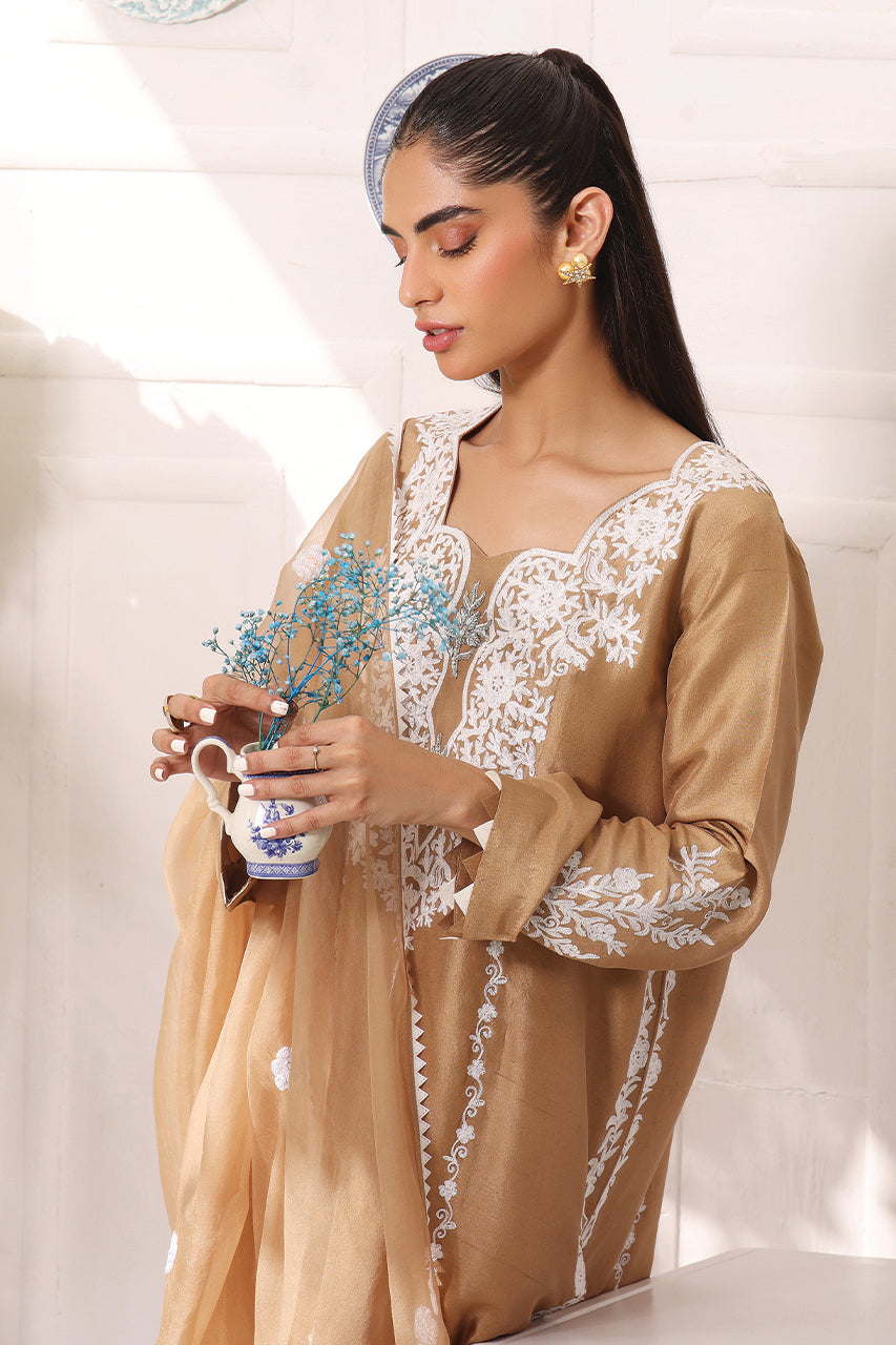 This luxurious raw silk panel shirt intricate Ari embroidery front and back that is delicately handcrafted to perfection detailed with namak para lace which is handmade embellished with handmade buttons, paired with embroidered organza dupatta and straight trouser