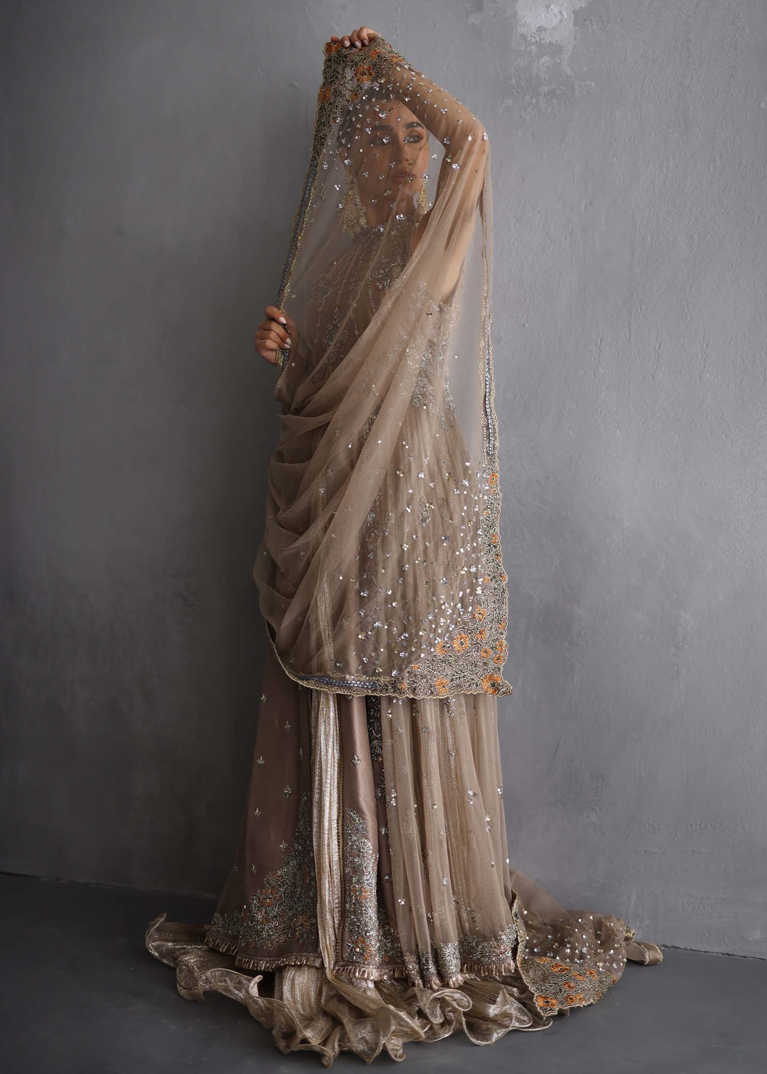 Includes: Shirt Lehanga Dupatta Fabric: Shirt: Raw Silk, French Net Lehanga: Metallic Lurex Dupatta: French Net Color: Mocha Beige Description: Collection’s sweetheart ‘ Honey Giltz’! A pure raw silk and French...