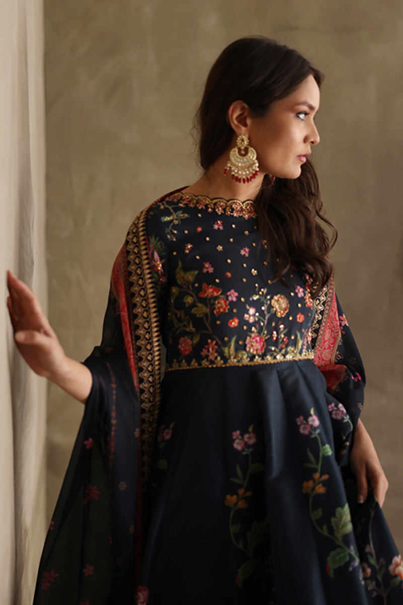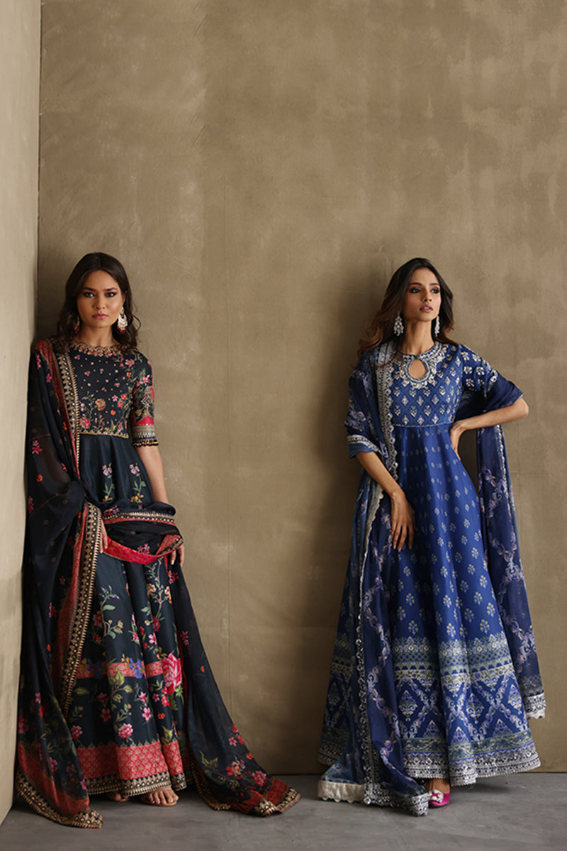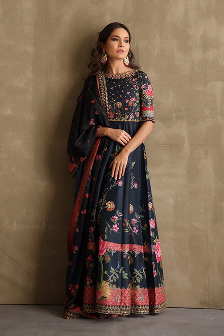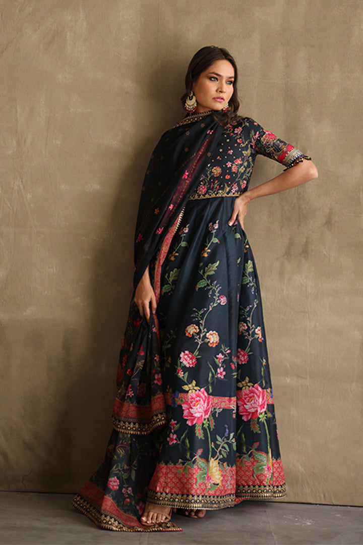 Classic and elegant, this MH printed pishwas is striking and beautiful with a zardozi hand embellished neckline and sleeves and embroidered border on the flare and dupatta.