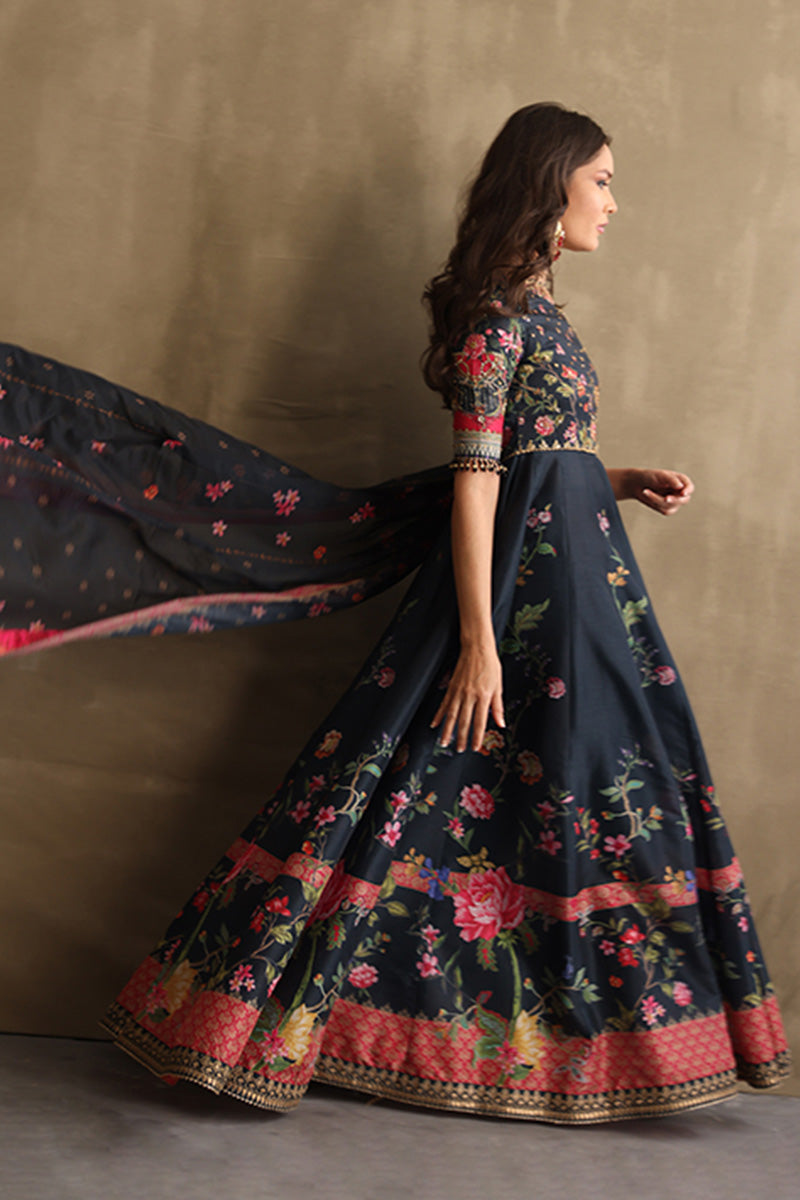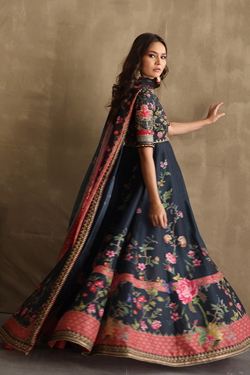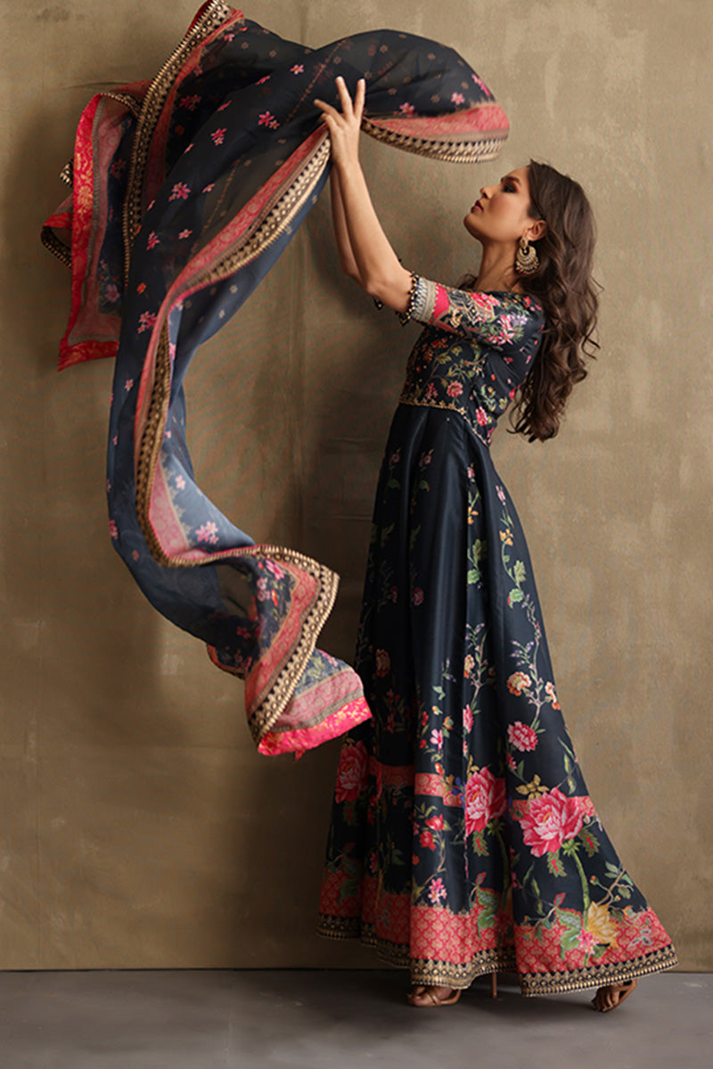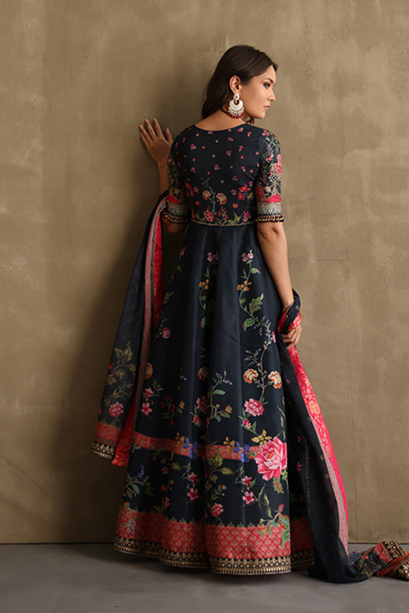 Classic and elegant, this MH printed pishwas is striking and beautiful with a zardozi hand embellished neckline and sleeves and embroidered border on the flare and dupatta.