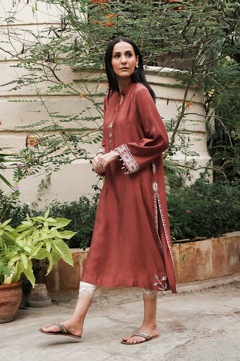 This standout piece from our Pret Collection is crafted from premium Khaddi cotton, offering a blend of elegance and durability. The outfit features intricate machine work, complemented by delicate handwork on the neck and sleeves for a personalized touch of craftsmanship. A sleek Sherwani collar adds a formal, sophisticated edge, while the running stitch detailing elevates the overall design. The appliqué on the sleeves introduces a bold, artistic element, further enhanced by chic hanging embellishments on the sleeves, making this piece a unique fusion of tradition and modern style.