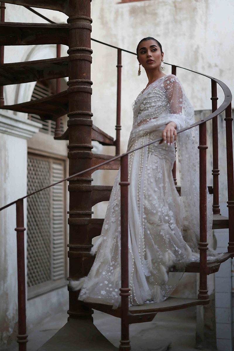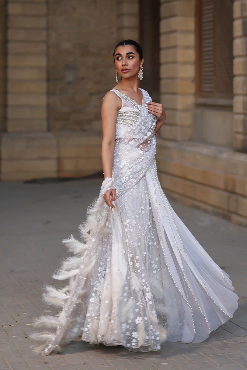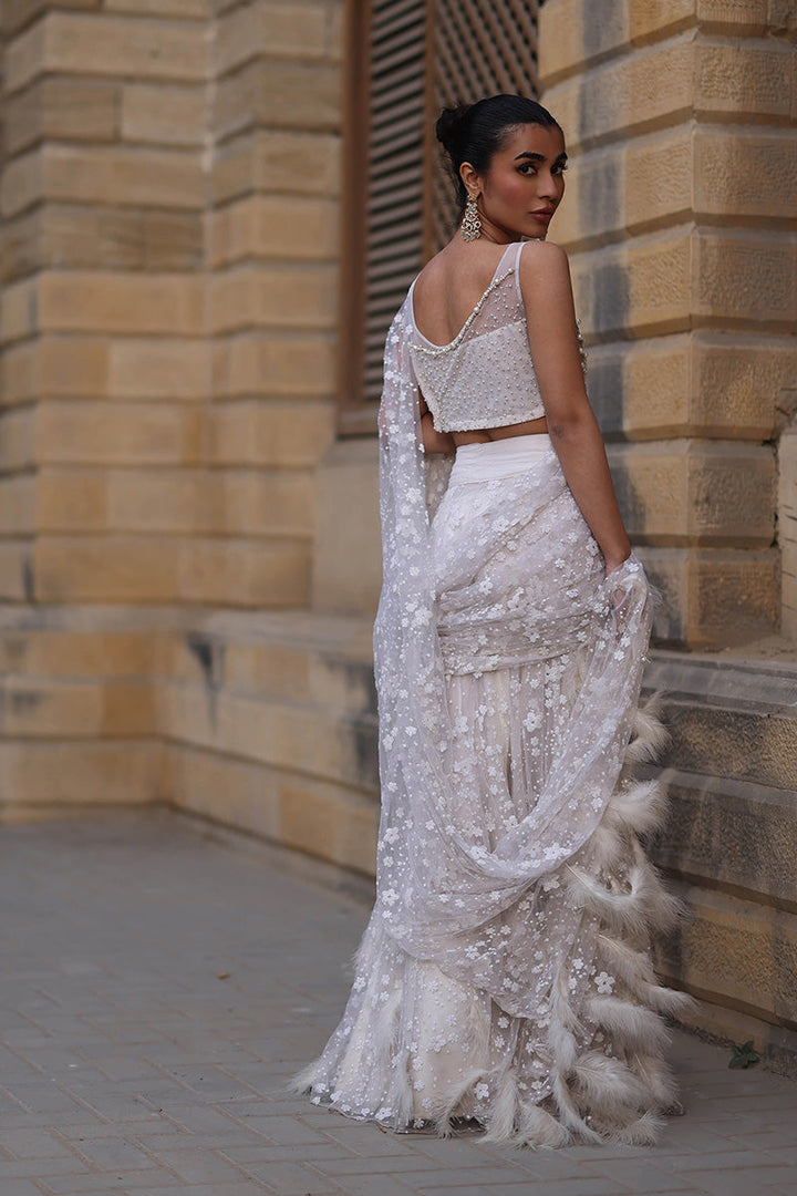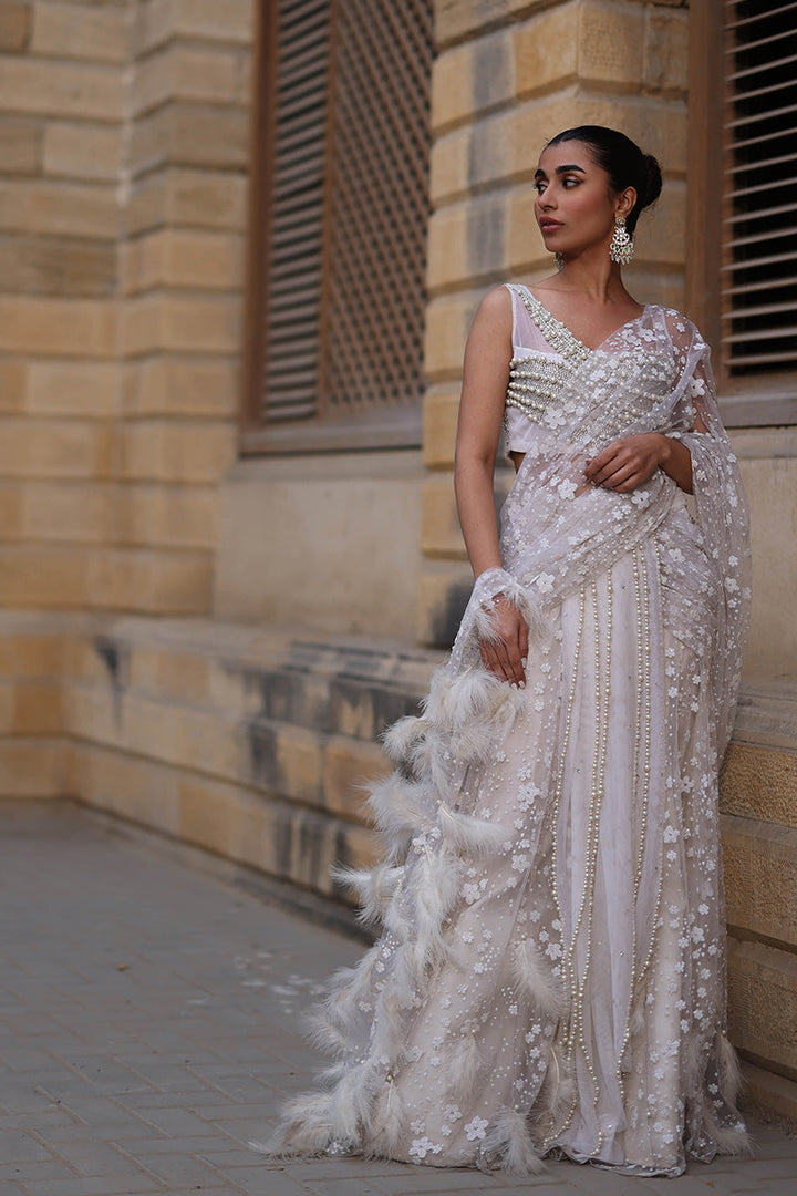 Feel like the princess of the skies in this gorgeous white saree. The saree features flowers and hand sewn feathers throughout. The blouse features delicate pearl kaam that adds a sense of opulence and grandeur to the outfit.