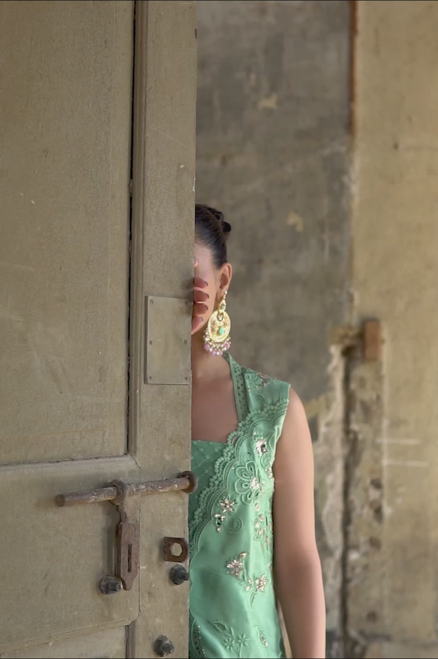 Step into the spotlight with our striking mint jacket meticulously crafted from pure silk and featuring stunning applique & cutwork, zardozi, gotta work and kaamdaani. Pair it with crushed silk...