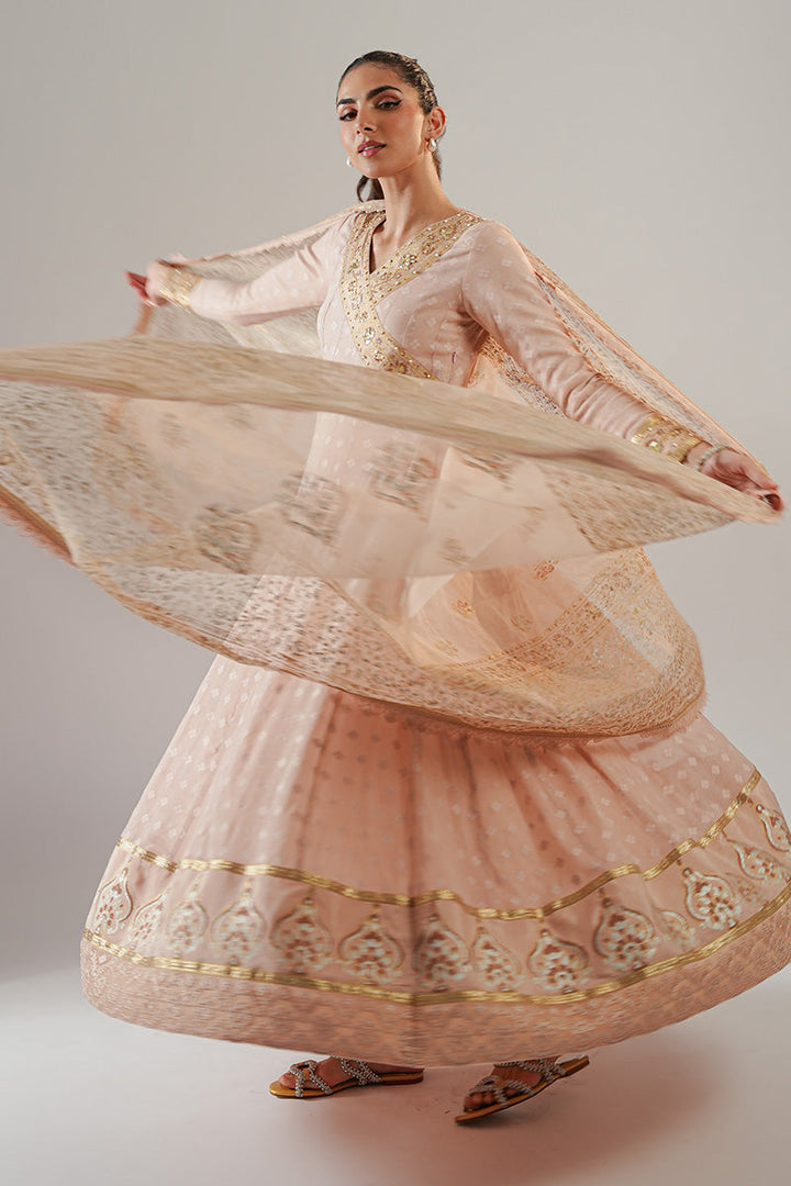 Our HOTSELLER cut is back!! Elegant cotton net nude pink kalidar exudes understated beauty with its intricate blockprint pattern, perfectly complemented by delicate hand embroidery that adds a touch of refined artistry. The kalidar is paired with an organza blockprinted dupatta, adorned with lace and finished with gota detailing that catches the light, adding a shimmering elegance to the look. This ensemble blends traditional craftsmanship with a modern, timeless appeal, making it a perfect choice for a special occasion or a festive celebration. Silk pants are an add on. Model height: 5'10. Maximum shirt length: 55"