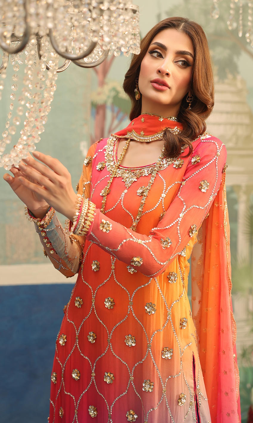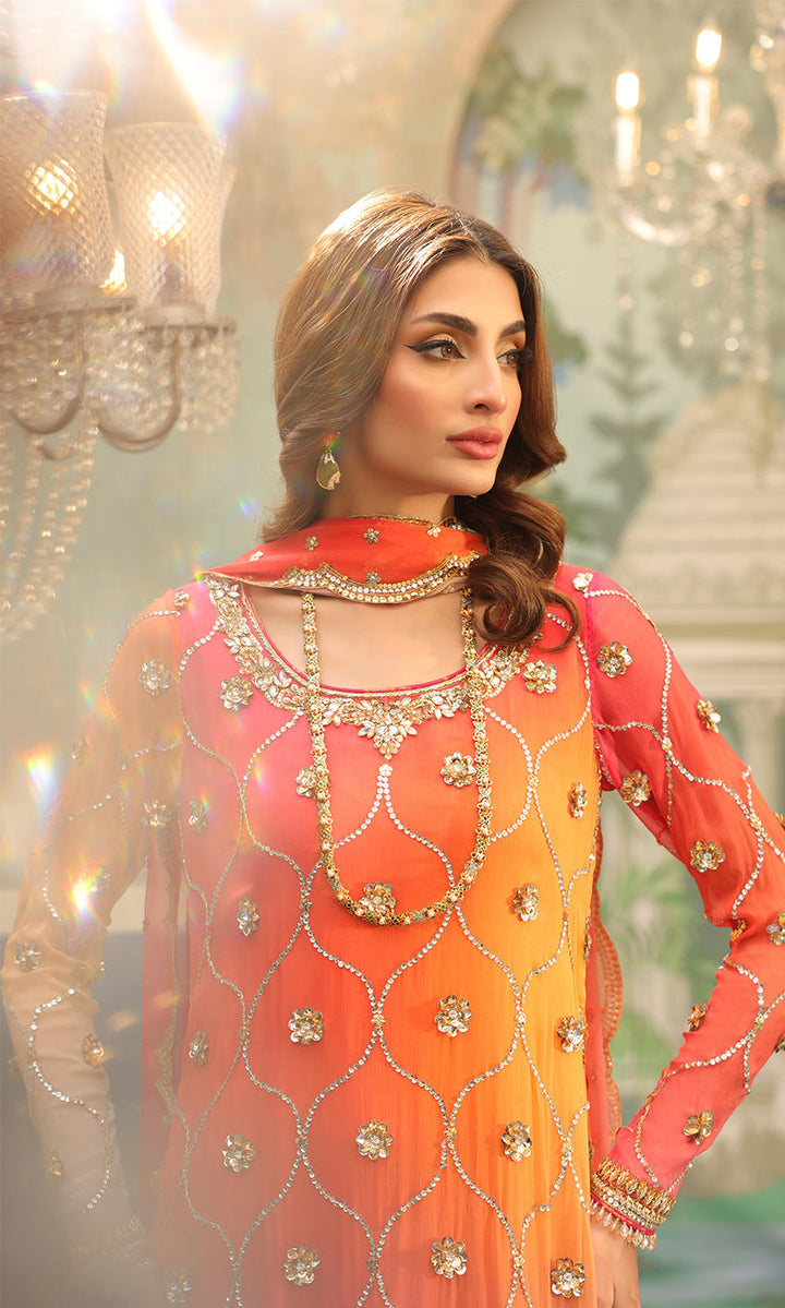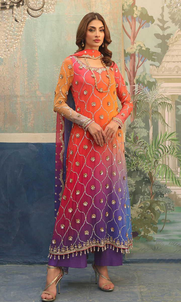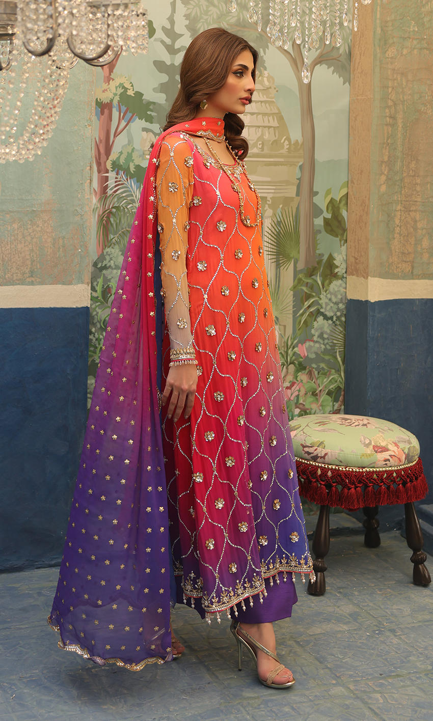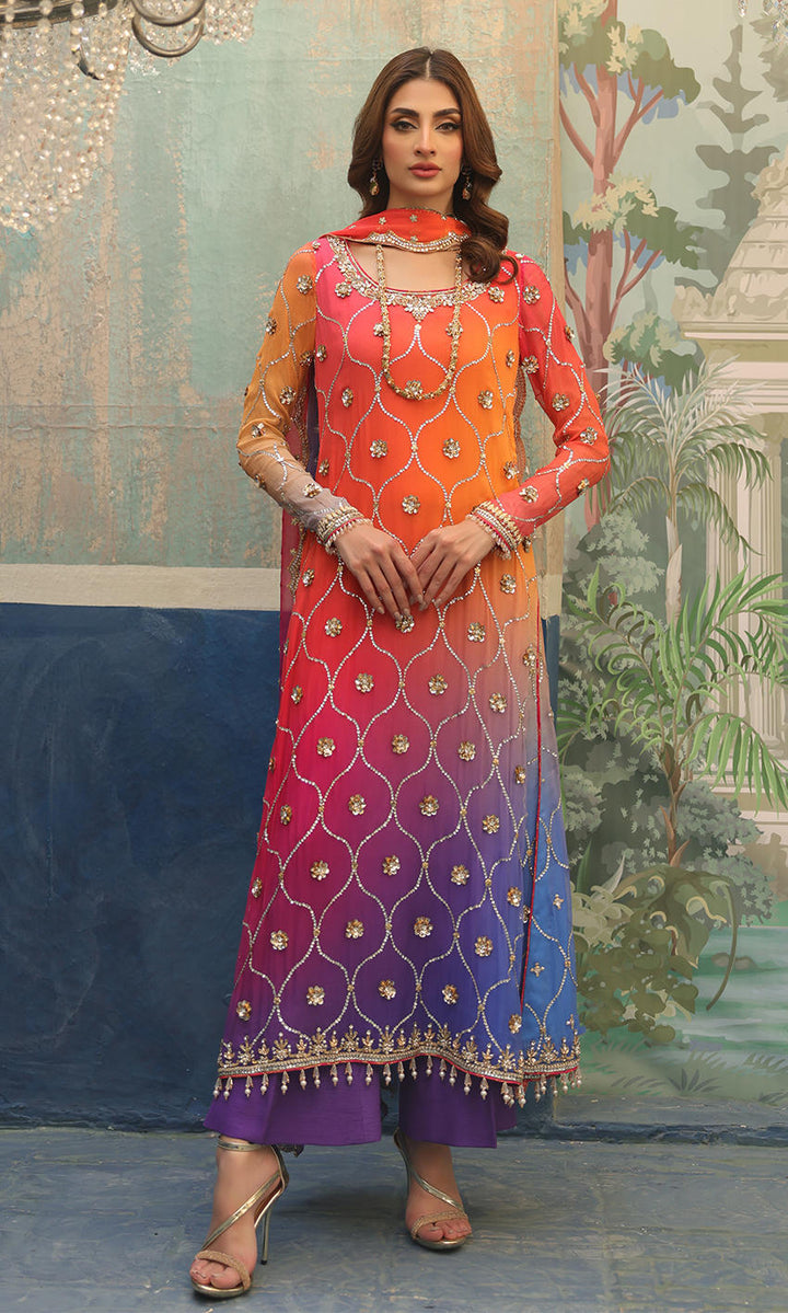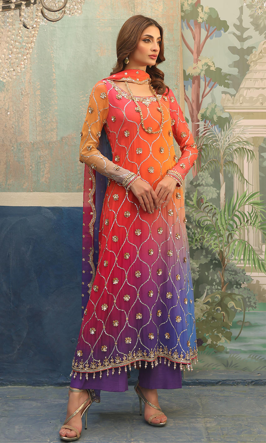 The vibrant ombre of this fiery orange to purple ensemble is bedazzled with a detailed hand embellished pattern all over, plus a worked dupatta to match.