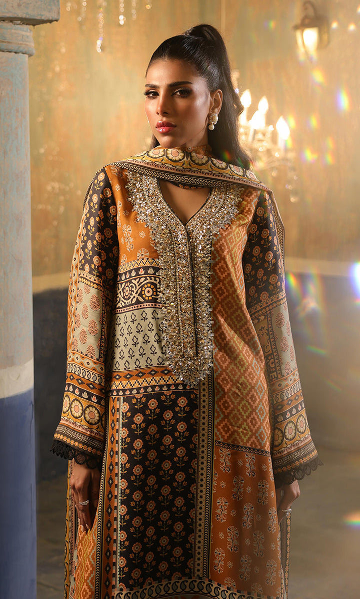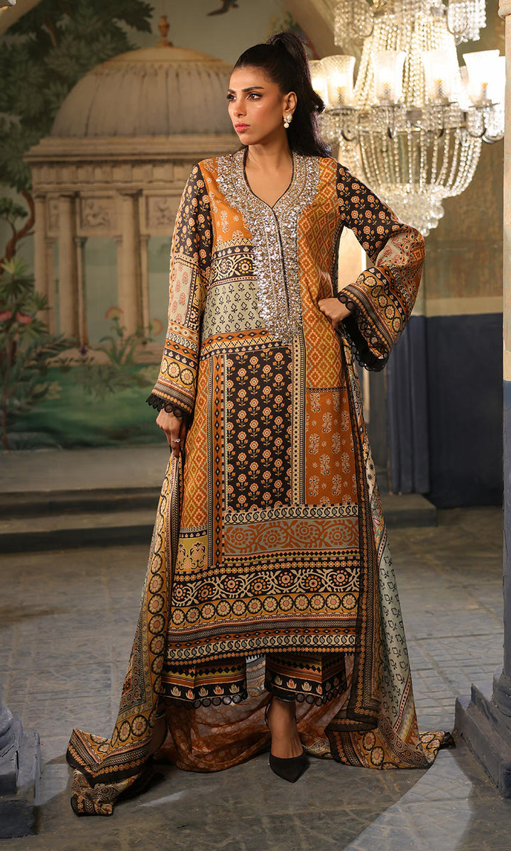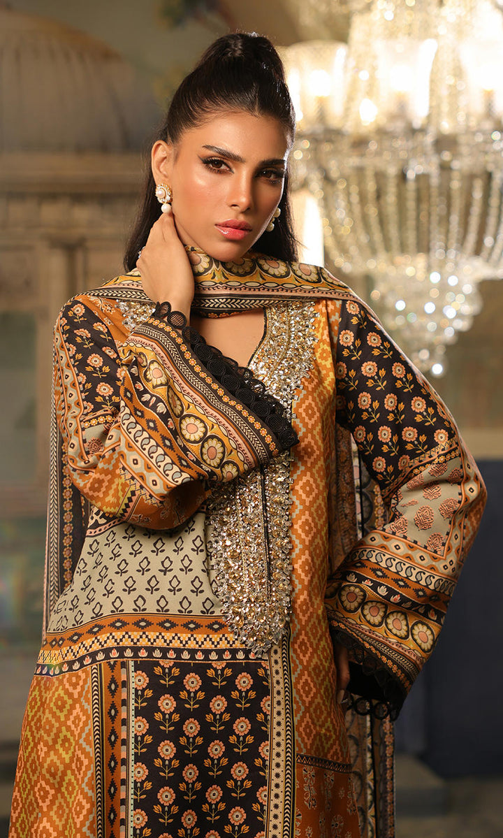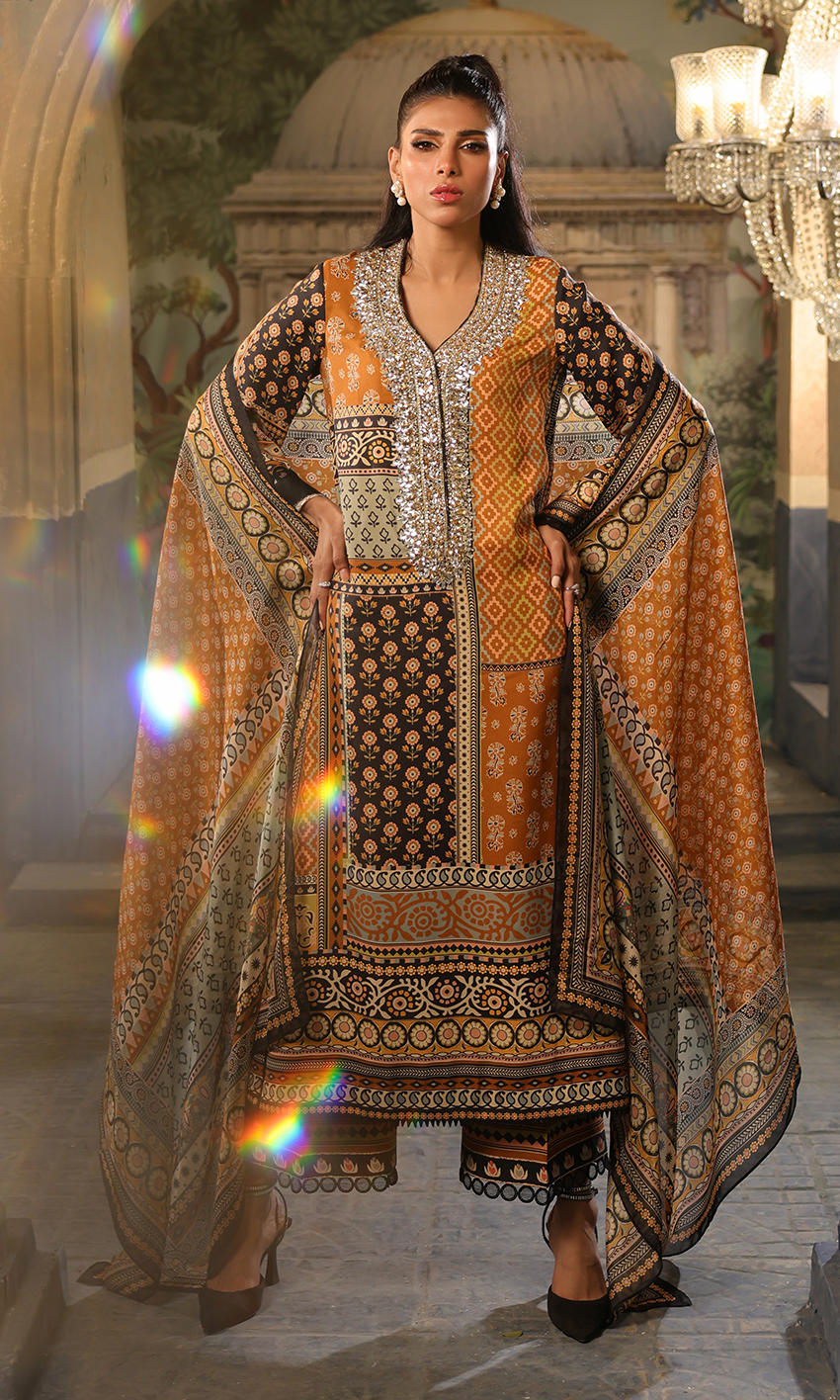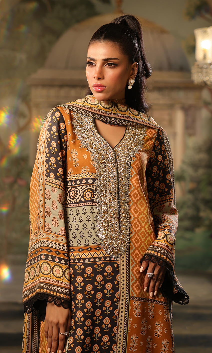 A smart black and mustard combination with elaborate signature crystal detailing on the neckline.