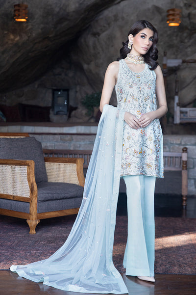 An ice blue, silk jamawar shirt designed with hand embroidery on the front and back; paired with matching, raw silk plain bootleg pants and a dupatta crafted with hand embroidery.
