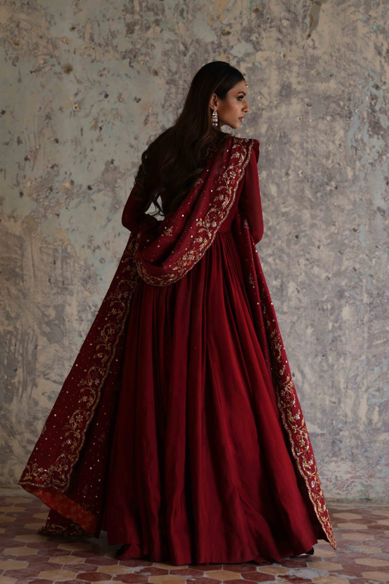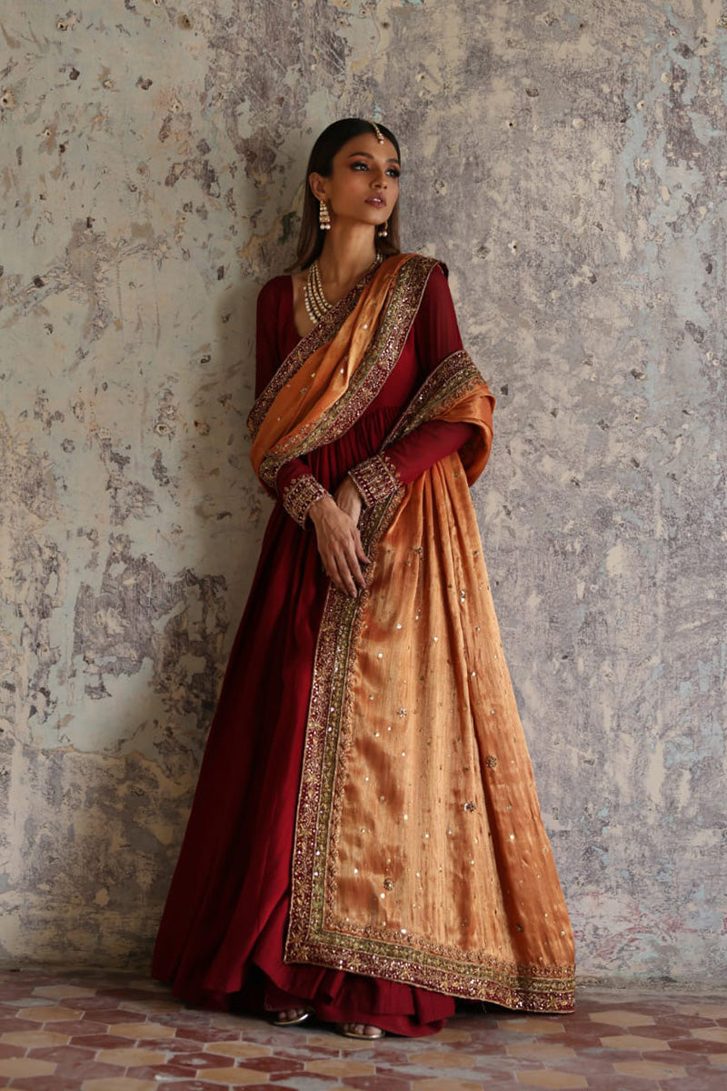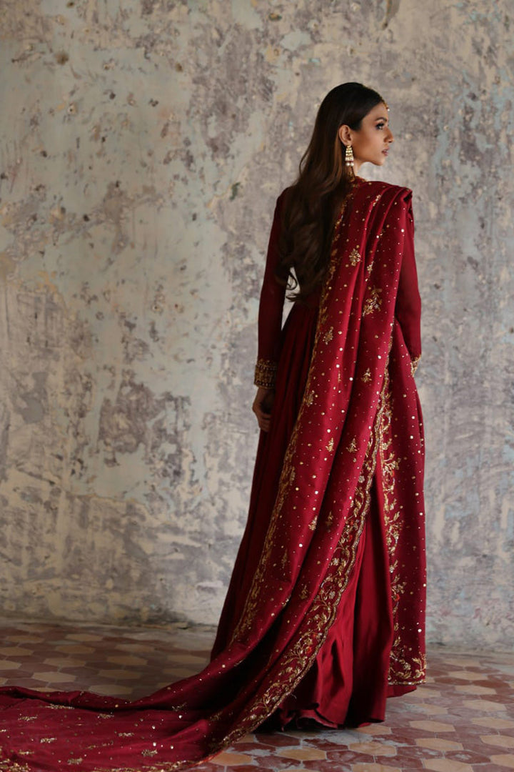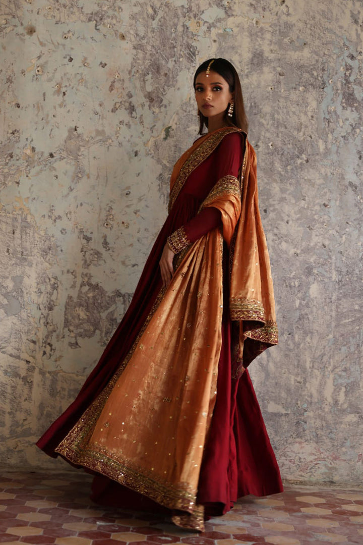 Feel right out of a Mughal fairytale in this Mina Hasan plain pishwas with a embellished dupatta.