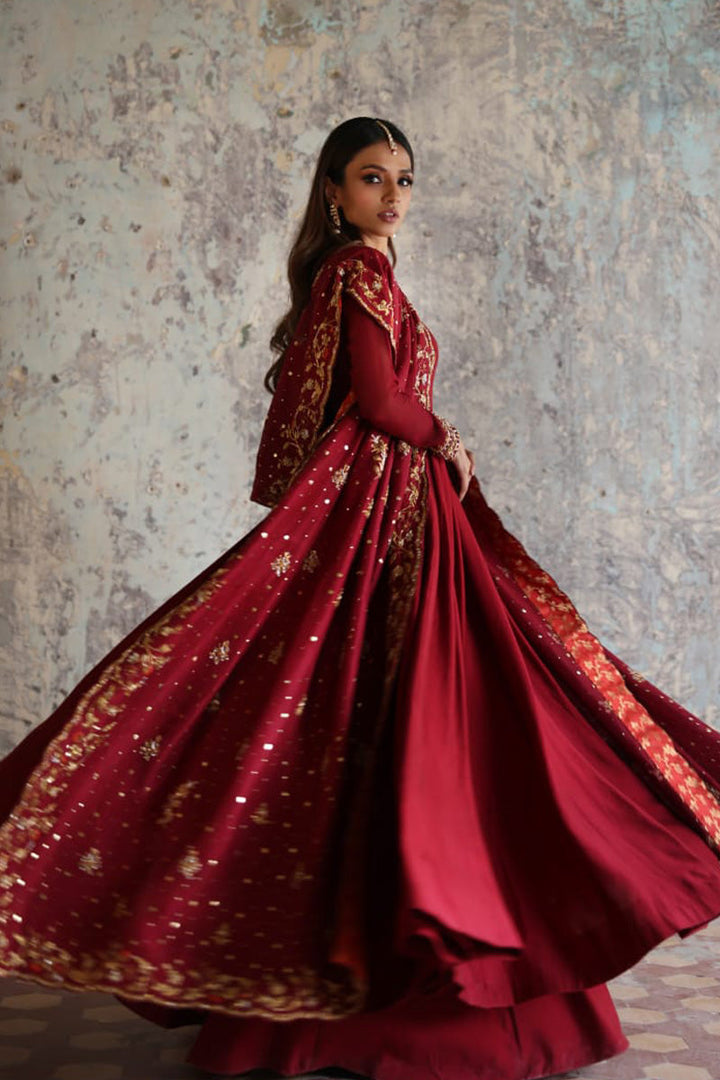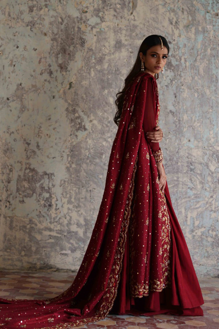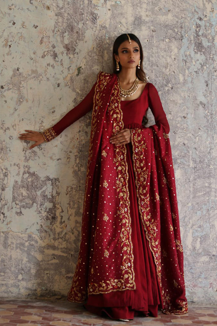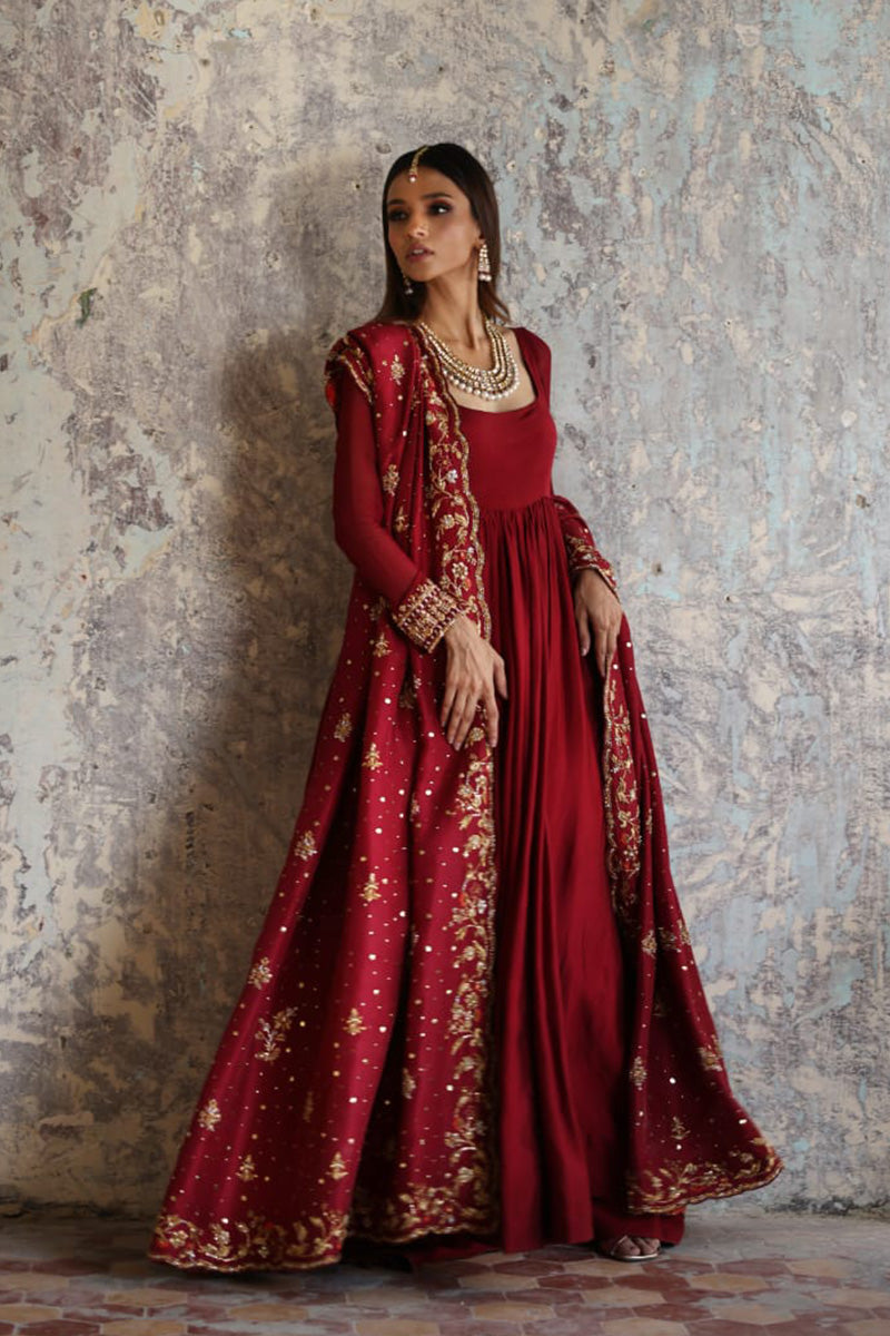 Feel right out of a Mughal fairytale in this Mina Hasan plain pishwas with a embellished dupatta.