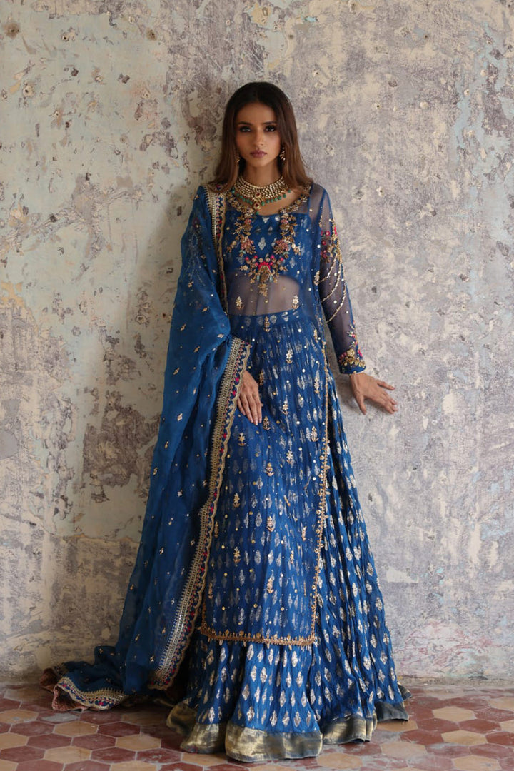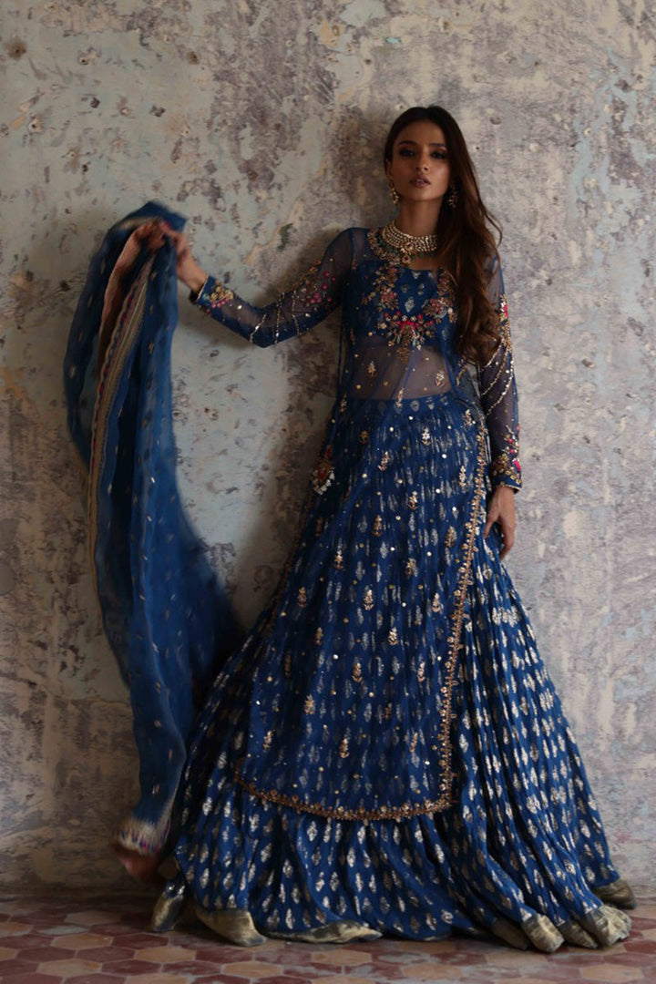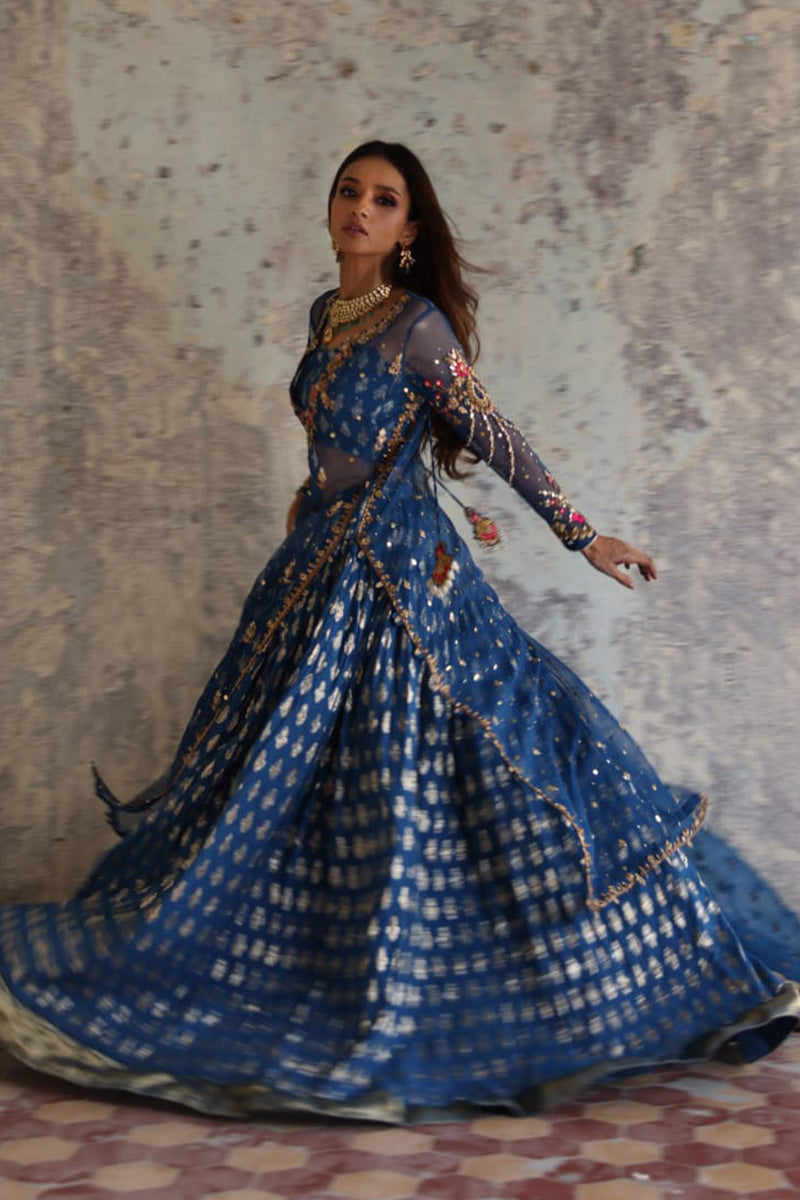 Be bold in this striking teal blue shirt with lehnga, perfect for a festive night out!