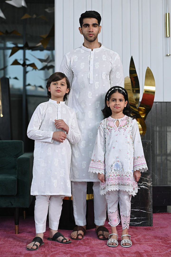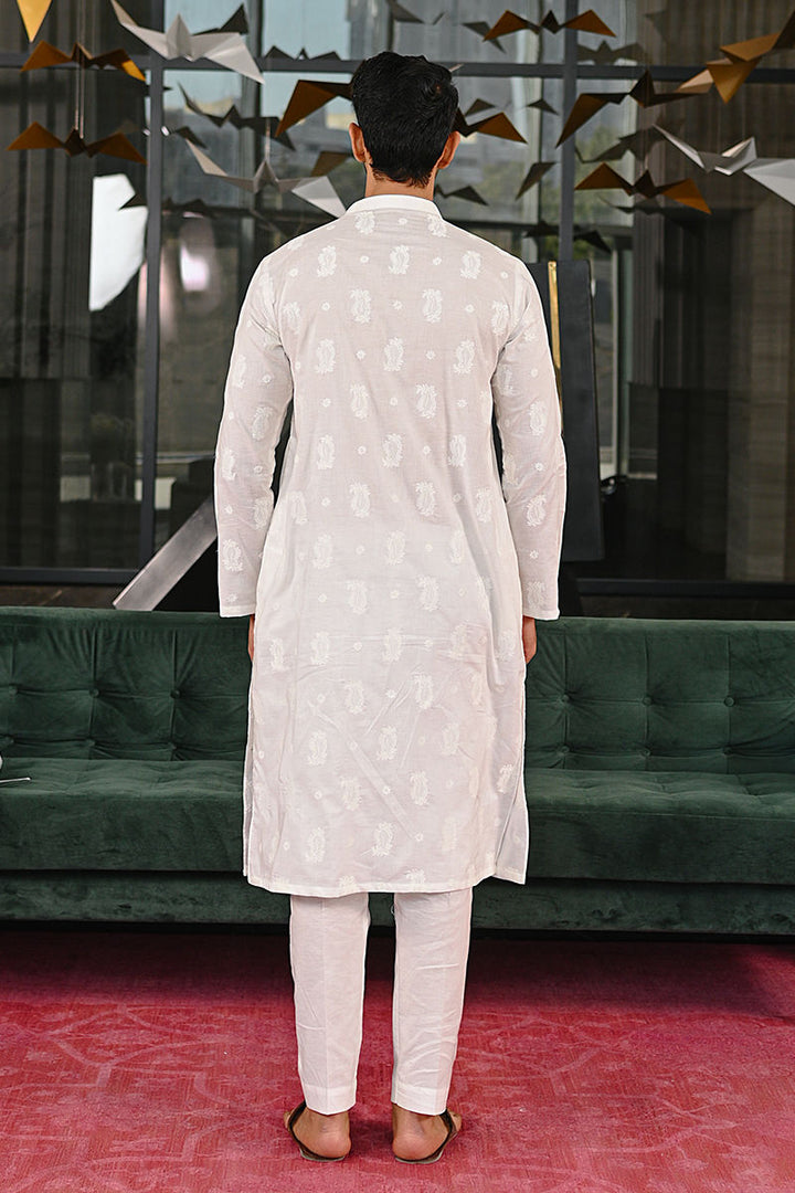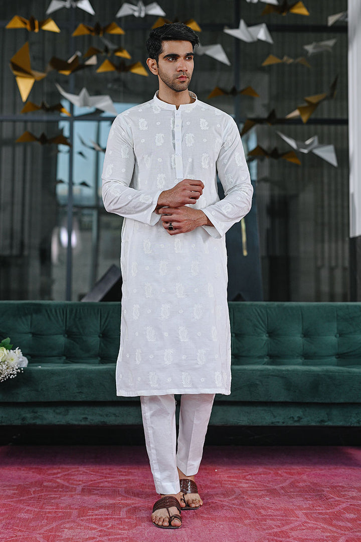 A classic white kurta with subtle self-embroidery, paired seamlessly with tailored pants for a look that’s timelessly refined.