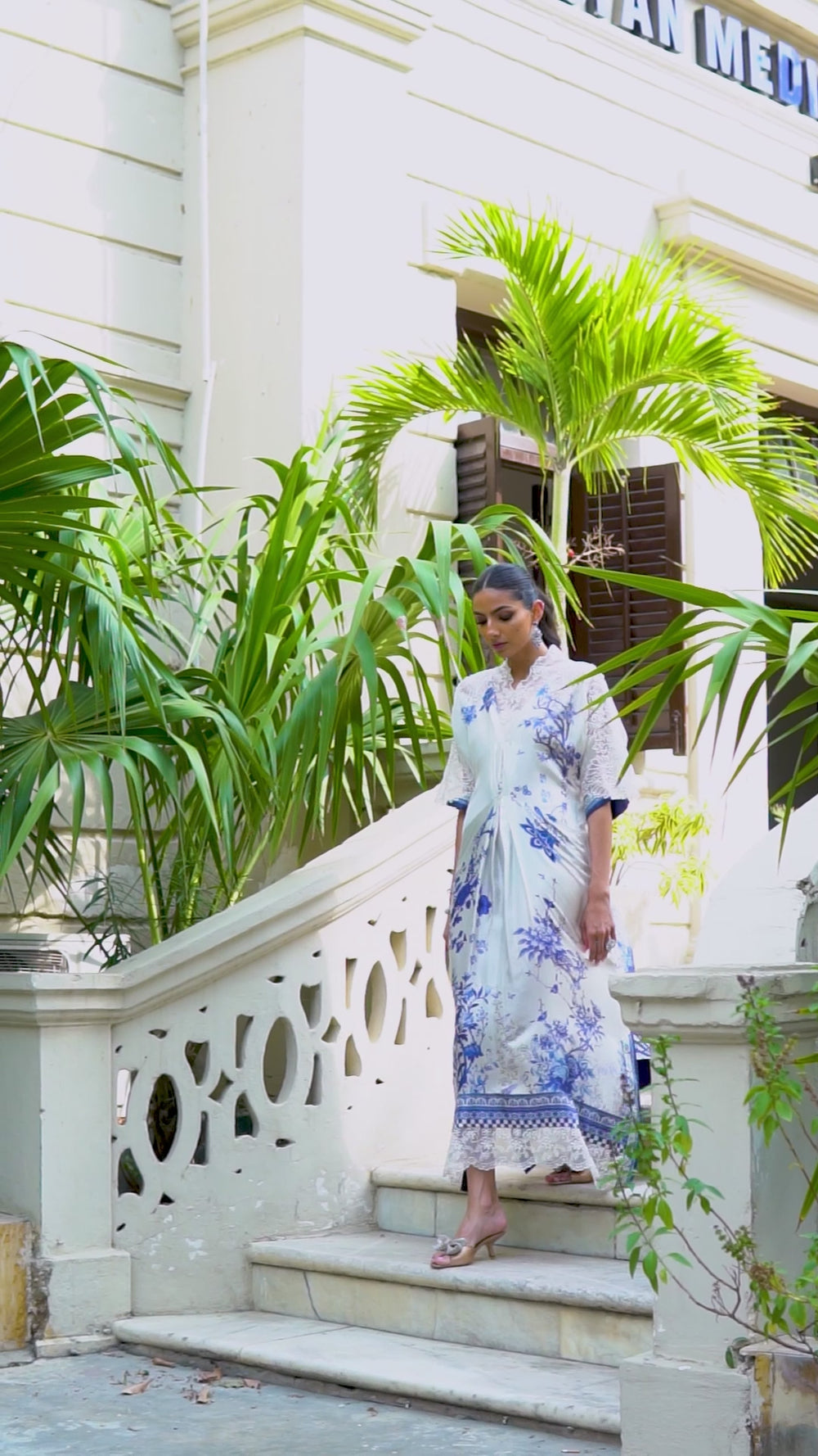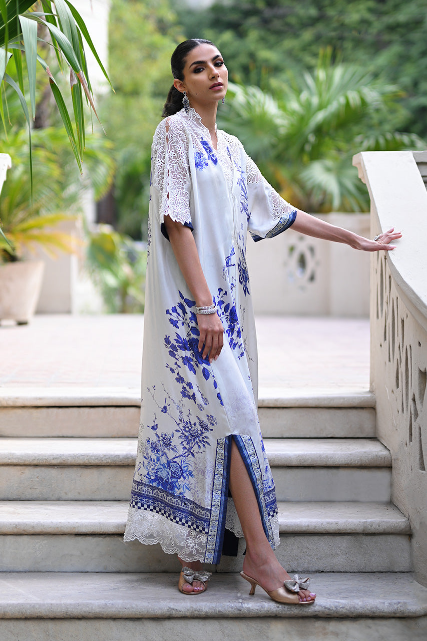 A striking summery print and signature N|F details make this kaftaan an indispensable addition to your wardobe. A canvas of white raw silk is emblazoned with dainty florals in striking cobalt. The neckline & sleeves are carefully detailed with pearl handworked pearl encrusted laces for a universally flattering look - laid back yet ultra stylish!