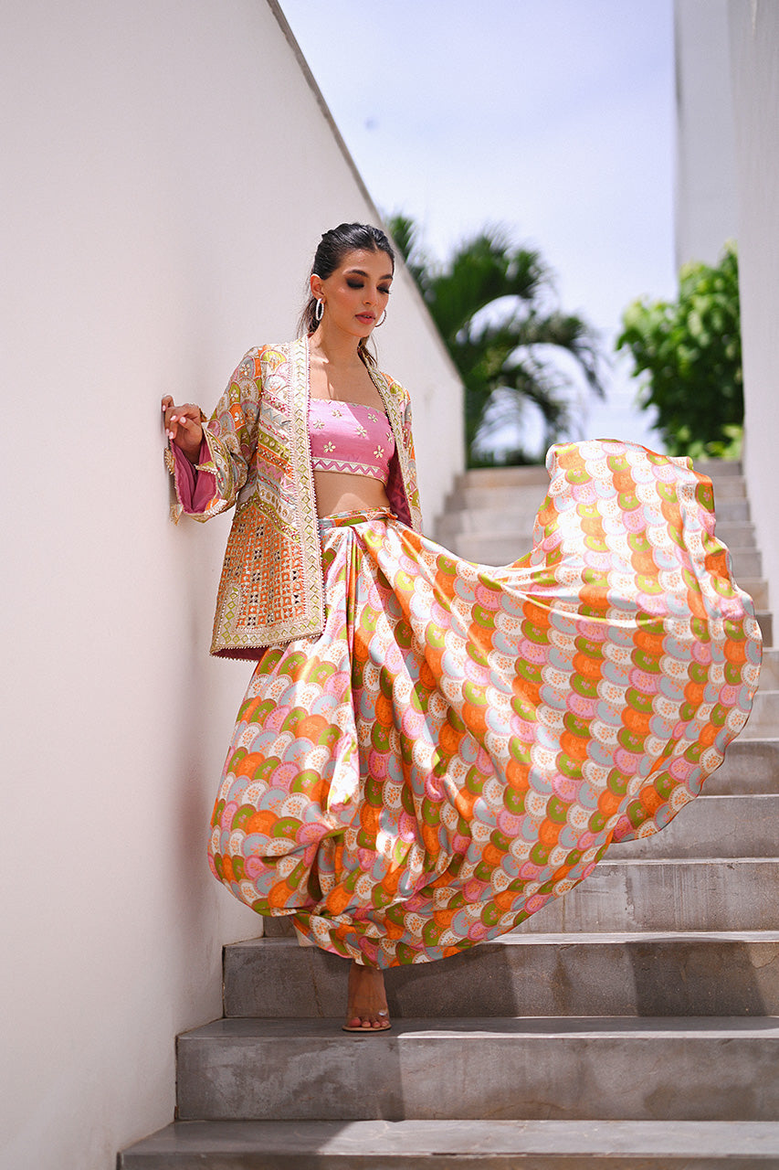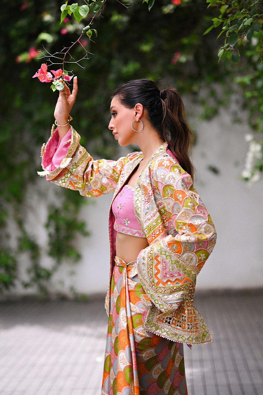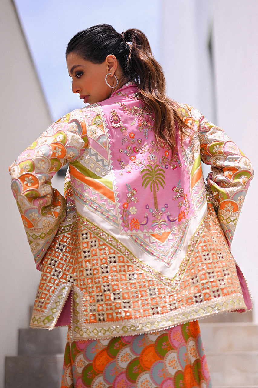 A kaleidoscope of lime, powder blue, candy pink, tangerine, and the celestial ivory, Kalisa exemplifies the festive spirit. The front open, structured, khaddi silk jacket is an exquisitely crafted piece featuring eyelet and chatta patti techniques with intricate gota details and tassels. The workmanship continues on the khaddi silk candy pink tube top with floral gota bunches. Finally the statement, draped skirt, cut from charmeuse, harmonises the entire look.