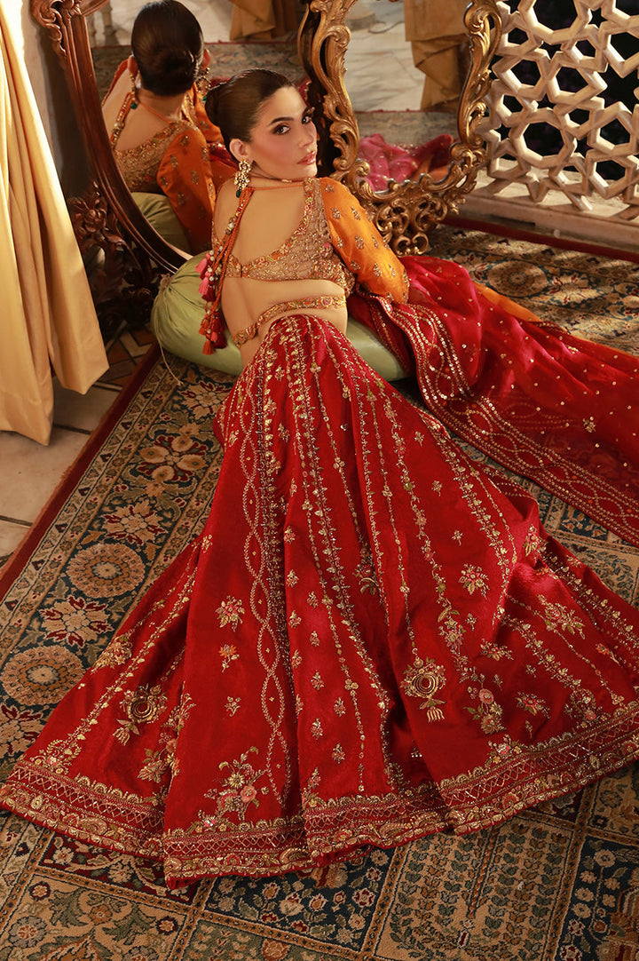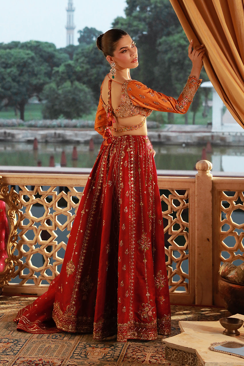An orange, silk jamawar blouse and a magenta, silk jamawar lehnga designed with hand embroidery; paired with an orange or a magenta organza dupatta crafted with hand embroidery.