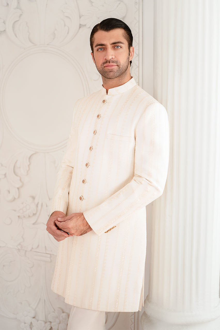 An ivory, muzlin sherwani (silk plain inner included) designed with hand embroidery on the front, back and sleeves; paired with a matching, raw silk plain pajama.