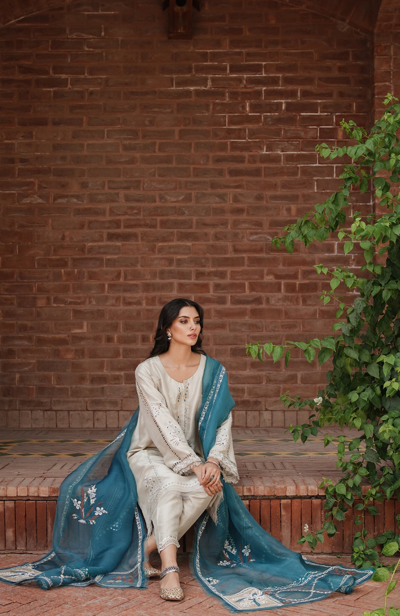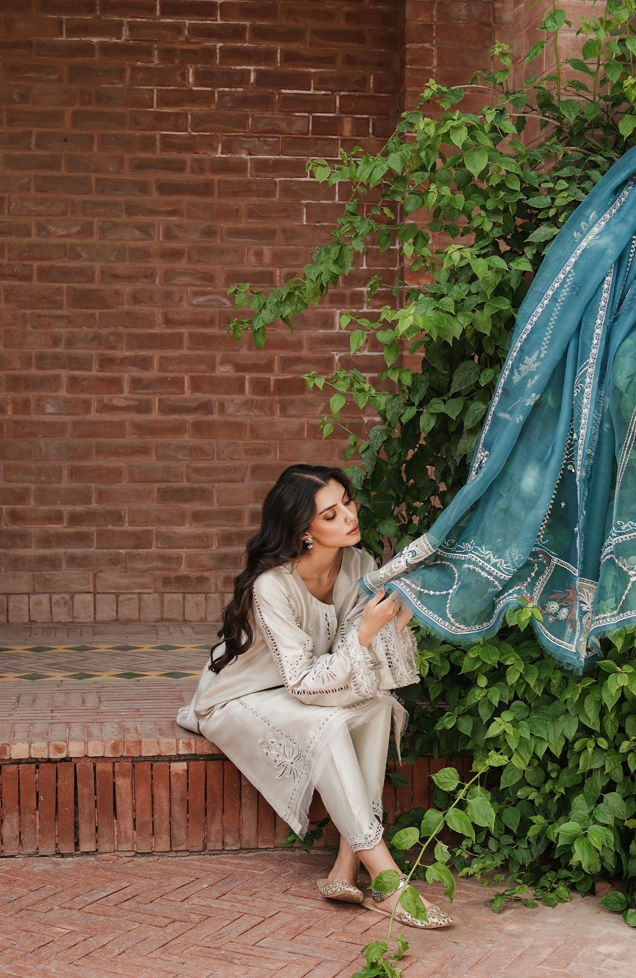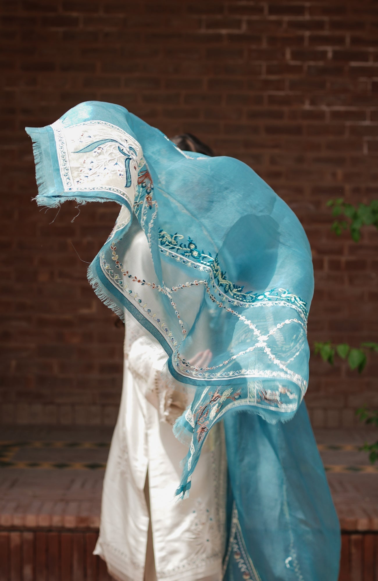 A classic magic mint shirt with tarkashi details on the sleeves, Kiran compiles applique, and resham embroidery work on the shirt. The neckline is luxuriously crafted with baadle work. Color blocked patch across the sides grabs attention with its exquisite artisanal Tukri and mirror accents. Kiran is infused with exclusive mixed media paired with the pants.