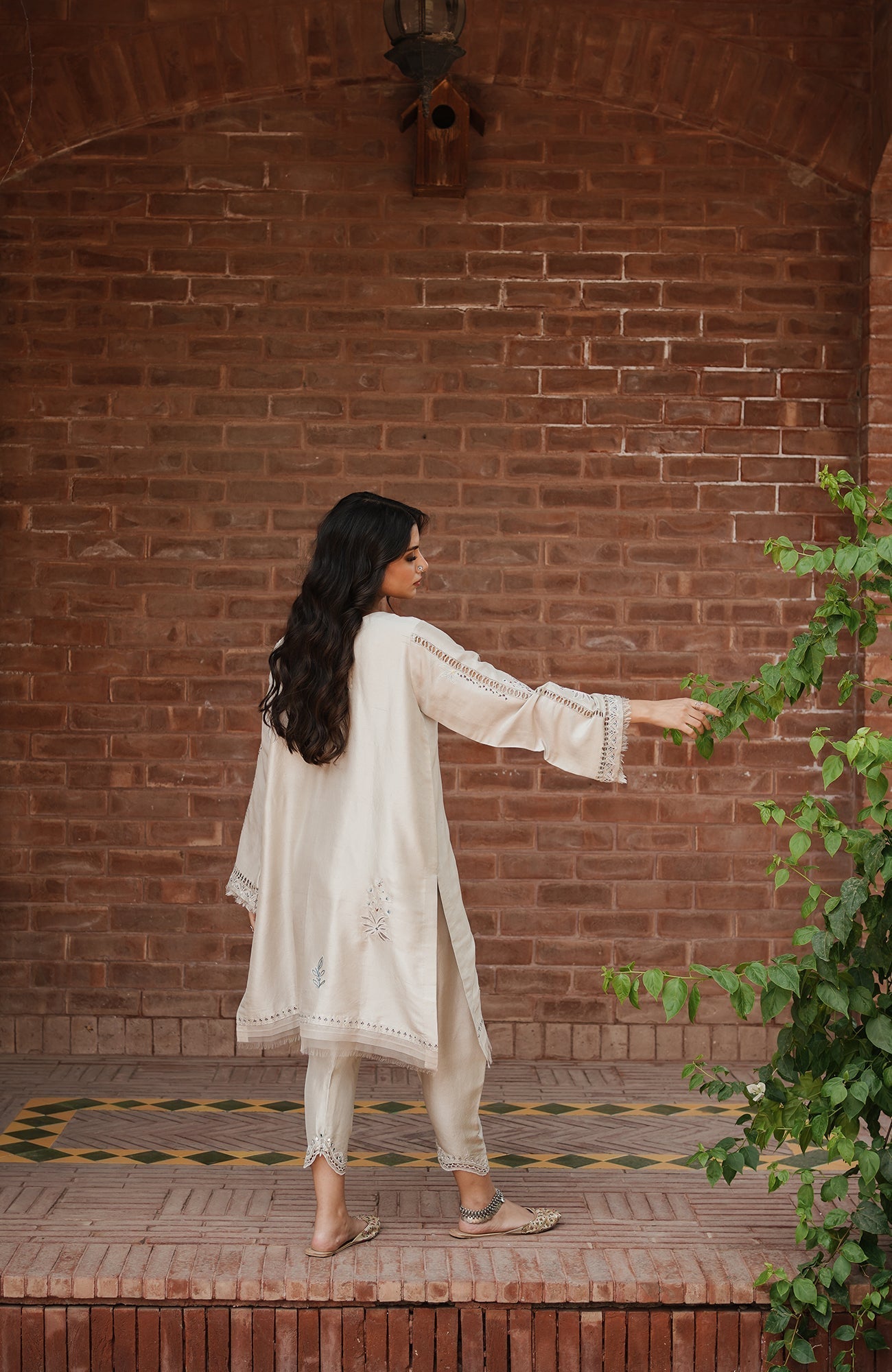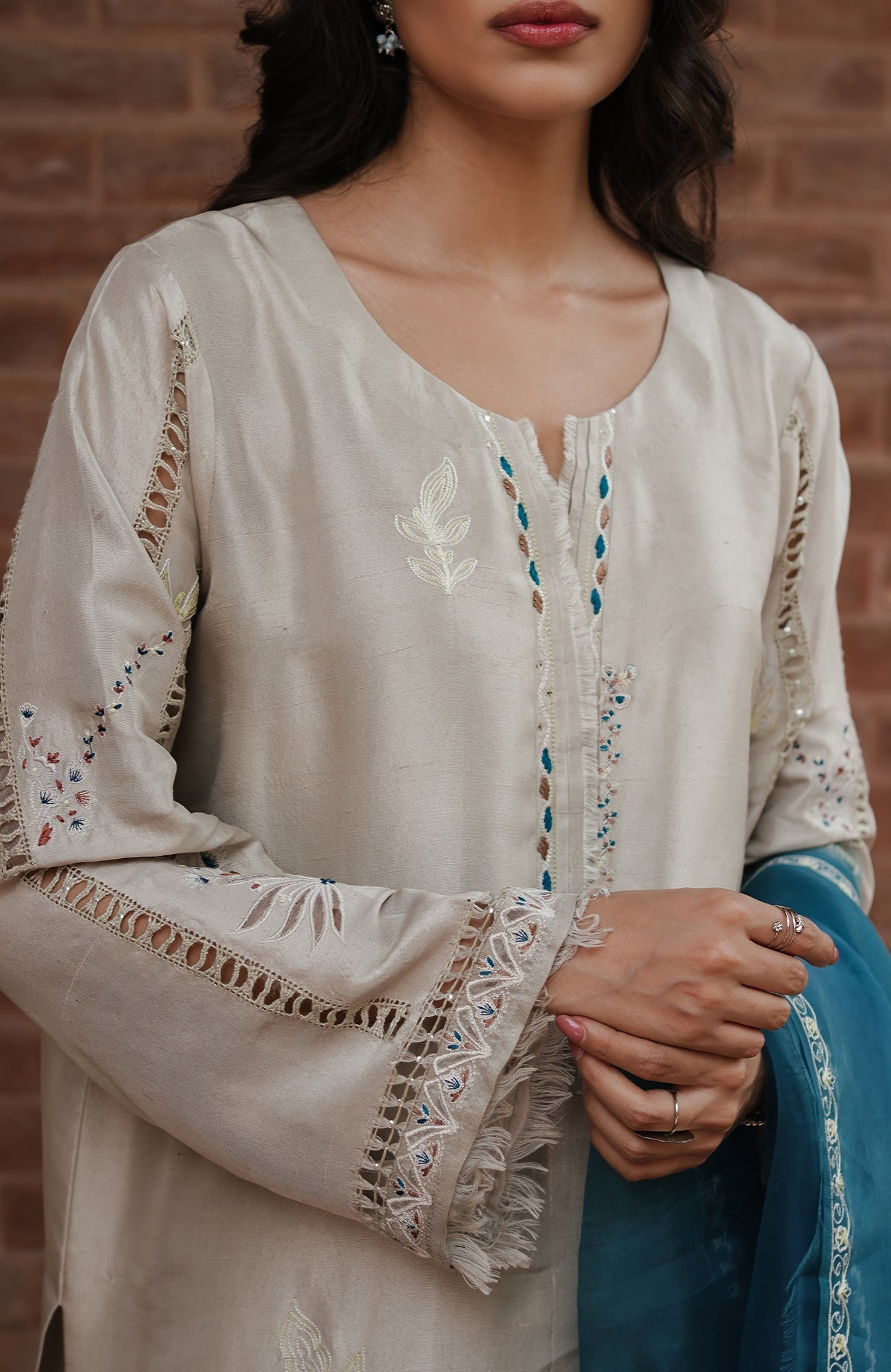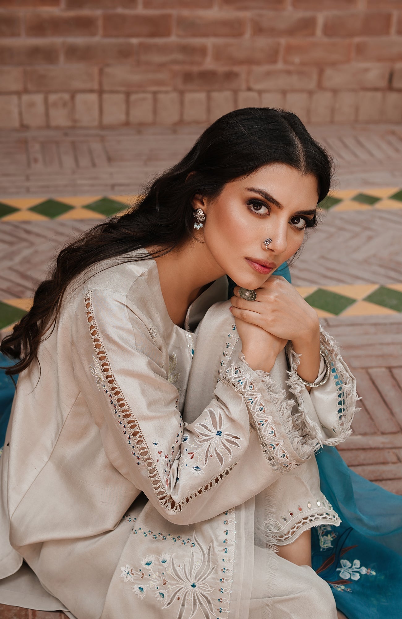 A classic magic mint shirt with tarkashi details on the sleeves, Kiran compiles applique, and resham embroidery work on the shirt. The neckline is luxuriously crafted with baadle work. Color blocked patch across the sides grabs attention with its exquisite artisanal Tukri and mirror accents. Kiran is infused with exclusive mixed media paired with the pants.
