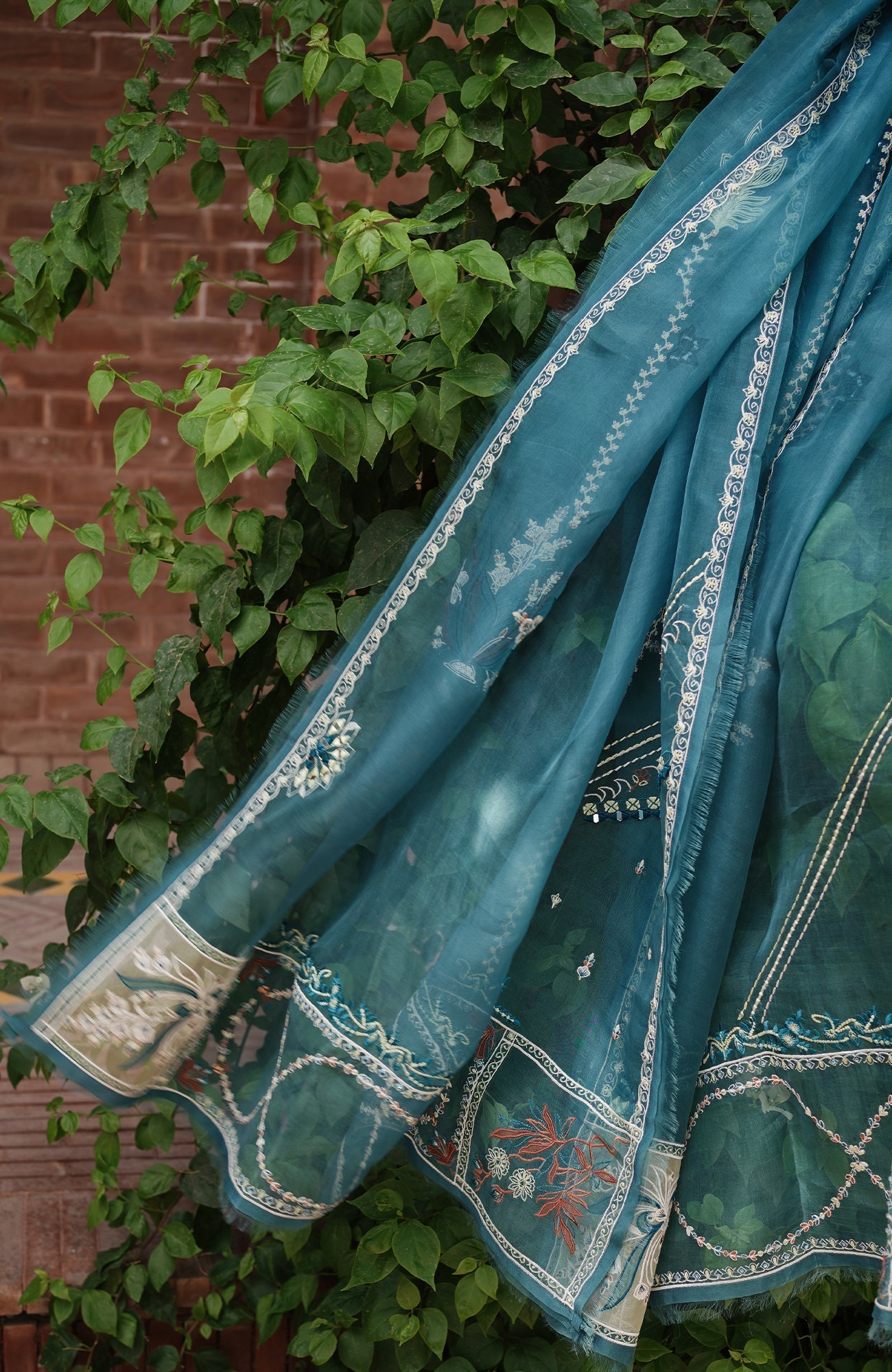 A classic magic mint shirt with tarkashi details on the sleeves, Kiran compiles applique, and resham embroidery work on the shirt. The neckline is luxuriously crafted with baadle work. Color...