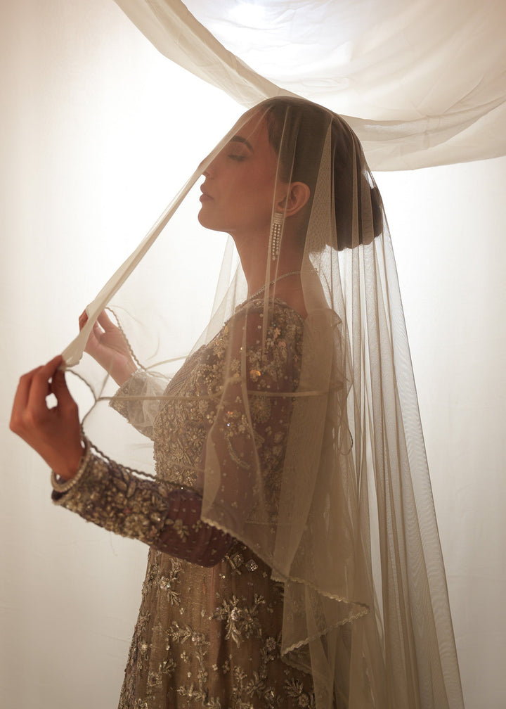 intricate handwork. The flowing pure meysuri gown in silver cloud, with gull gray bodice and sleeves, pairs elegantly with a layered lame lehenga over an atlas lining. Delicate hand aari embroidery exudes timeless elegance, while a shimmering meysuri dupatta, adorned with sequins, stones, kora, and dabka, adds a regal touch. A true masterpiece of sophistication.
