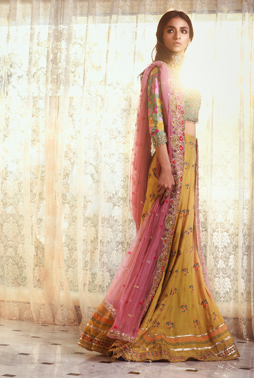 A mirror embroidered choli in gold tilla paired with a block printed lengha which is enhanced with gotta detailing. It is complemented with a lilac heavily worked dupatta with borders and booty sprinkle.