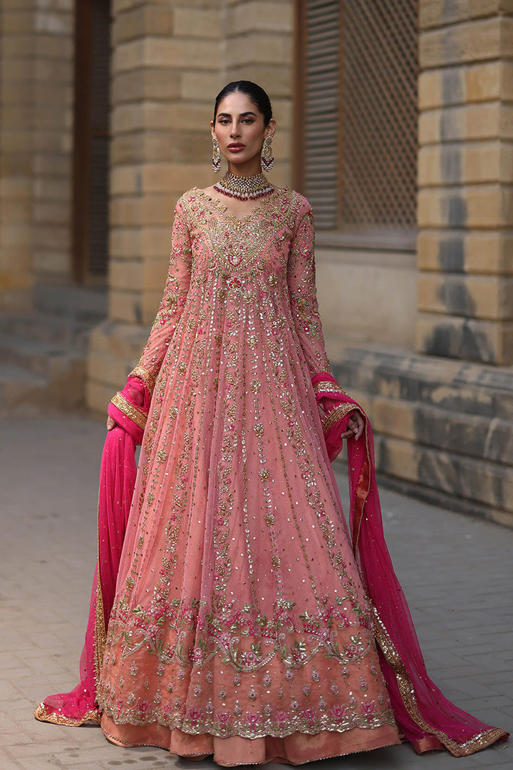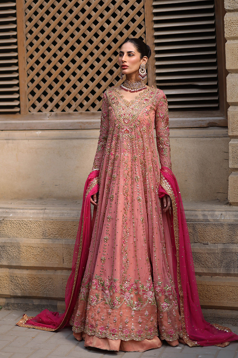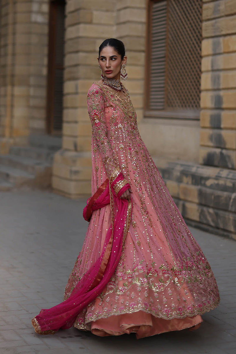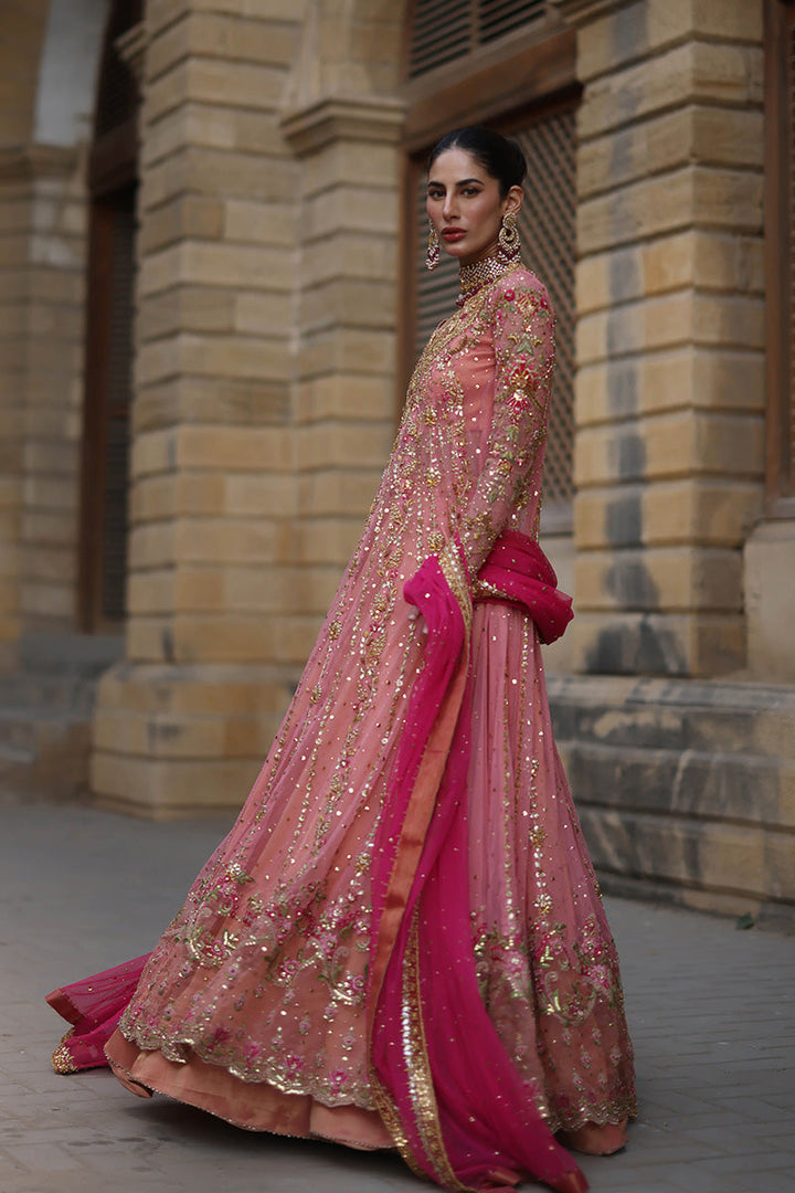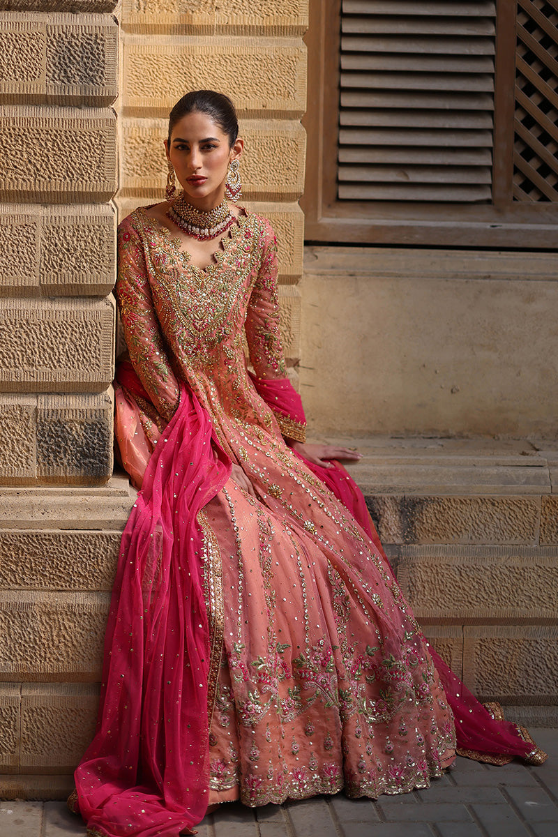 Feel like a princess from the Mughal courts in this signature Mina Hasan pishwaas. The outfit features zardozi, mukesh, dabki and nakshi kaam in the outfits. The neckline features subtle embroidered flowers.