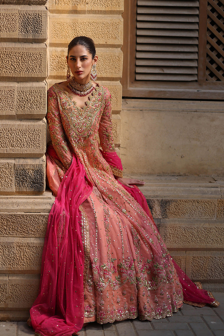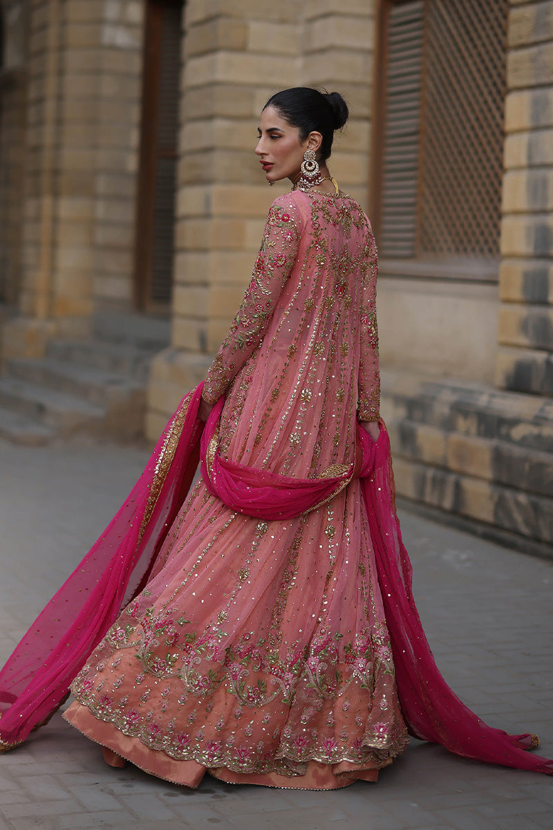 Feel like a princess from the Mughal courts in this signature Mina Hasan pishwaas. The outfit features zardozi, mukesh, dabki and nakshi kaam in the outfits. The neckline features subtle...