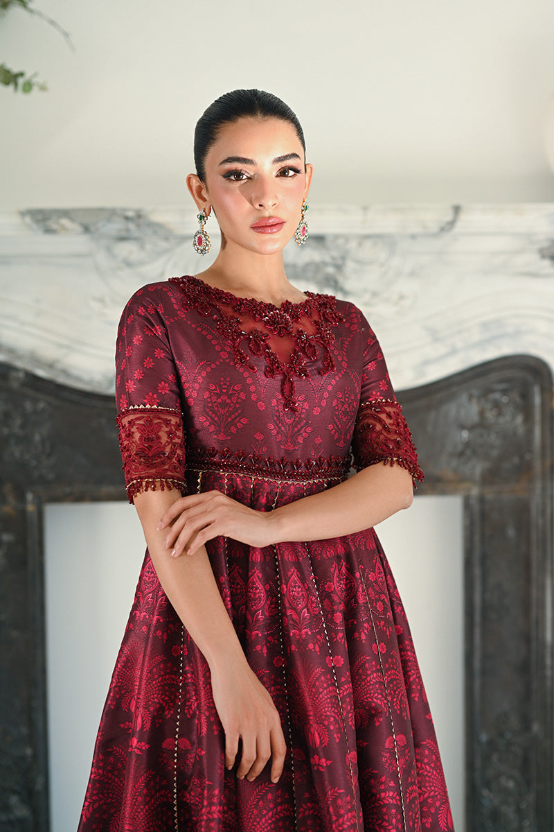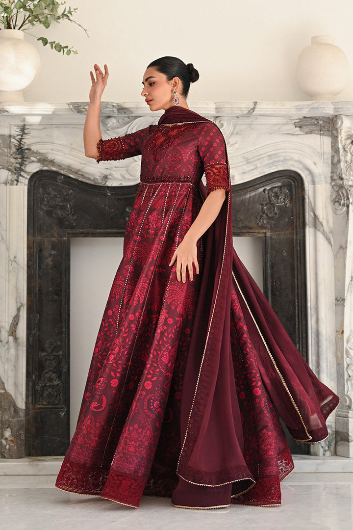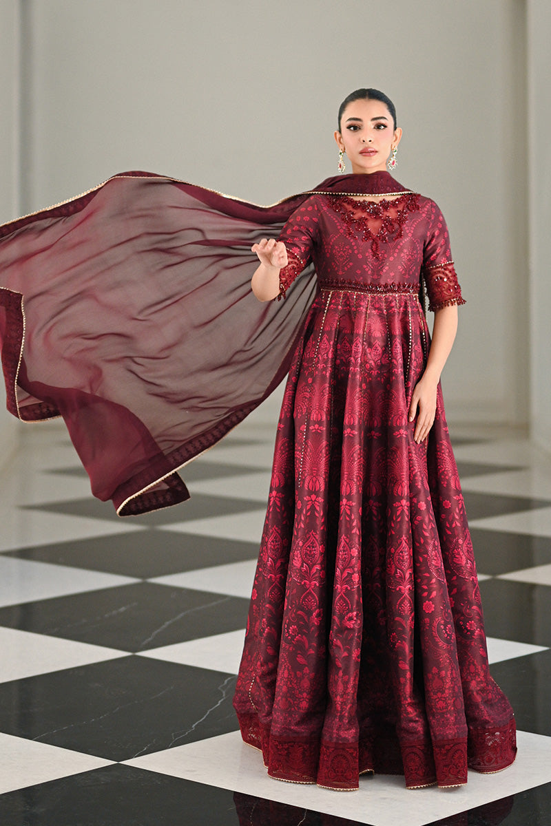 Our signature printed pishwas makes a comeback in a Mina Hasan favourite- burgundy crystal kaam! Hand work details adorn the bodice whille the daaman of the pishwas rounds off with...